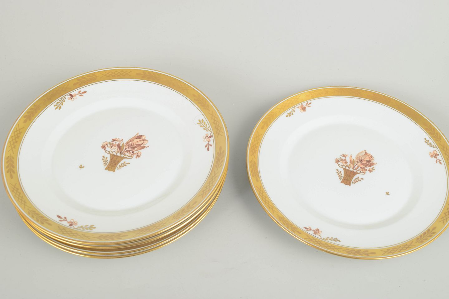 Set of five elegant lunch plates in porcelain from Royal Copenhagen’s “Golden Basket” series, model 595/9589. Classic white porcelain with gilded rim and hand-painted floral basket motif.
