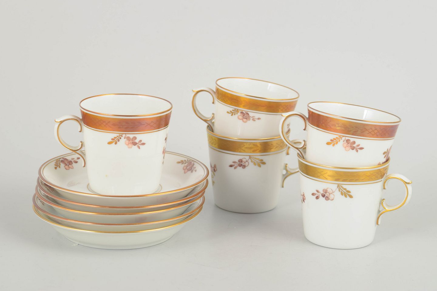 Beautiful set of five demitasse cups with matching saucers from Royal Copenhagen’s “Golden Basket” series, model 595/9093. Executed in porcelain with gilded rims and hand-painted floral decoration.