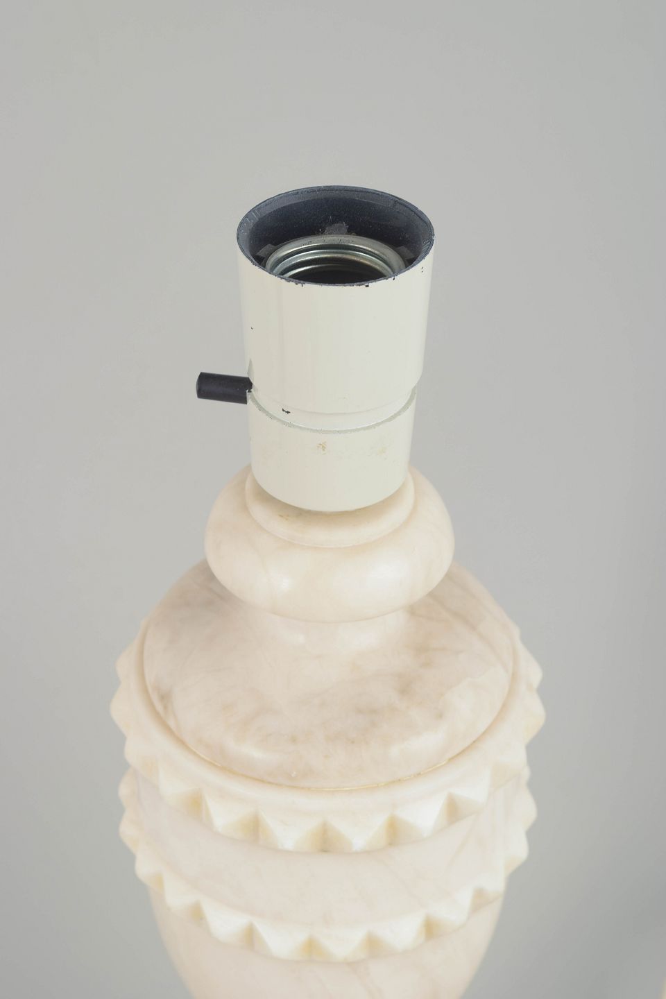 Sculptural table lamp in light marble featuring a decorative band of small carved notches around the upper midsection. The classic urn shape combined with the rounded base creates a soft, harmonious and decorative appearance.