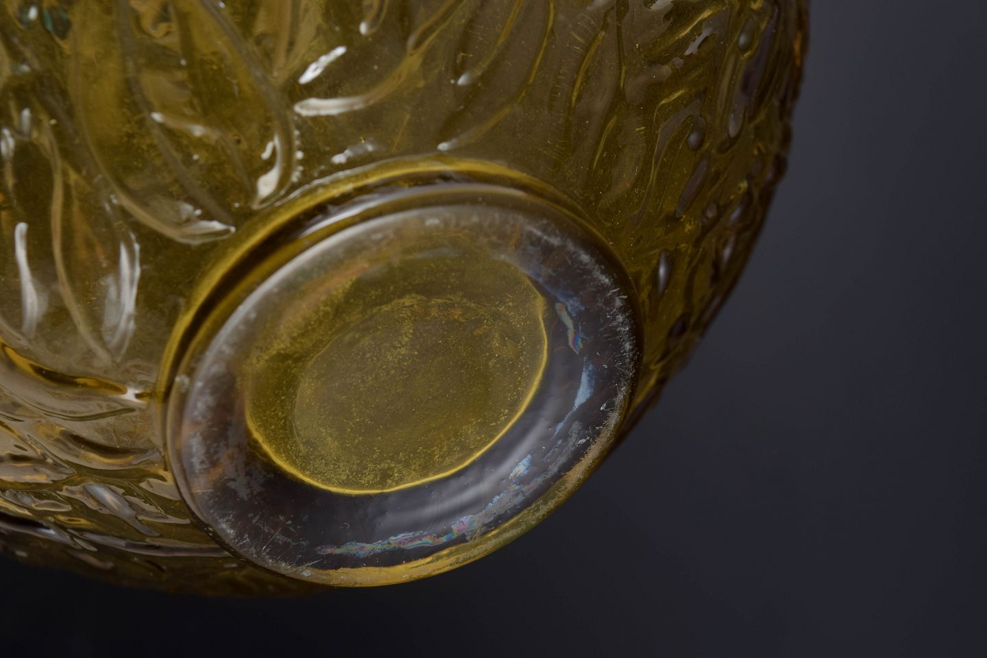 Decorative, mouth-blown vase in amber-coloured glass with deeply moulded relief featuring leaves and berries. The organic ornamentation and warm tone are characteristic of French art glass from the mid-20th century.