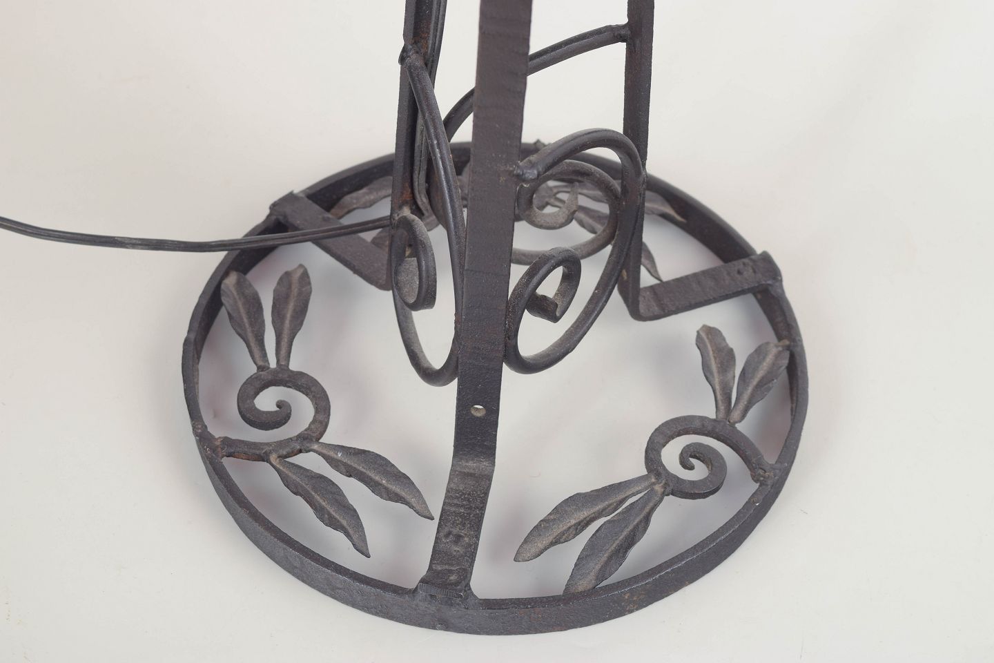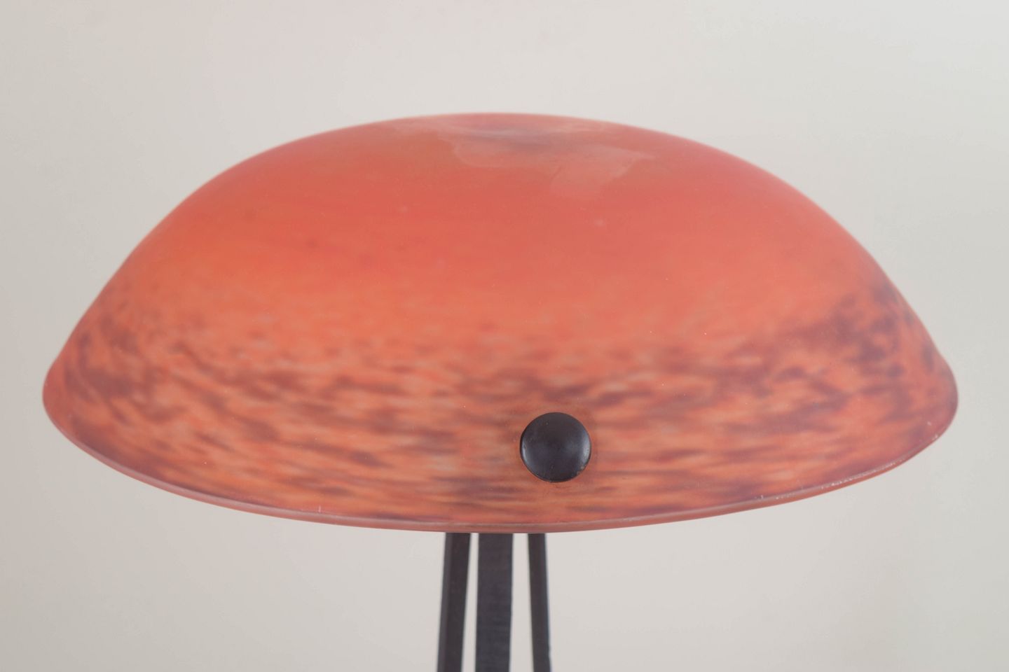 Decorative table lamp in the Art Nouveau style with a cast-iron base and a handmade art glass shade in warm, reddish tones. The organic silhouette and swirling iron tendrils create an elegant, sculptural presence.