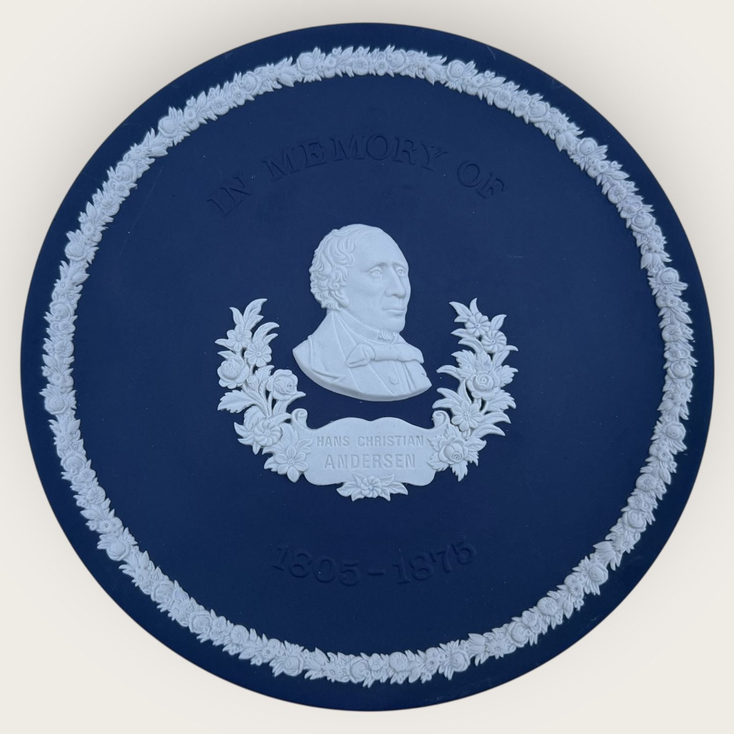 Wedgwood, H.C. Andersen, Dark Blue Memorial Plate, " In memory of H.C. Andersen 1805-1875", plate no. 1045 of 2000 pieces, Diameter 20.5cm, in original box *perfect condition*