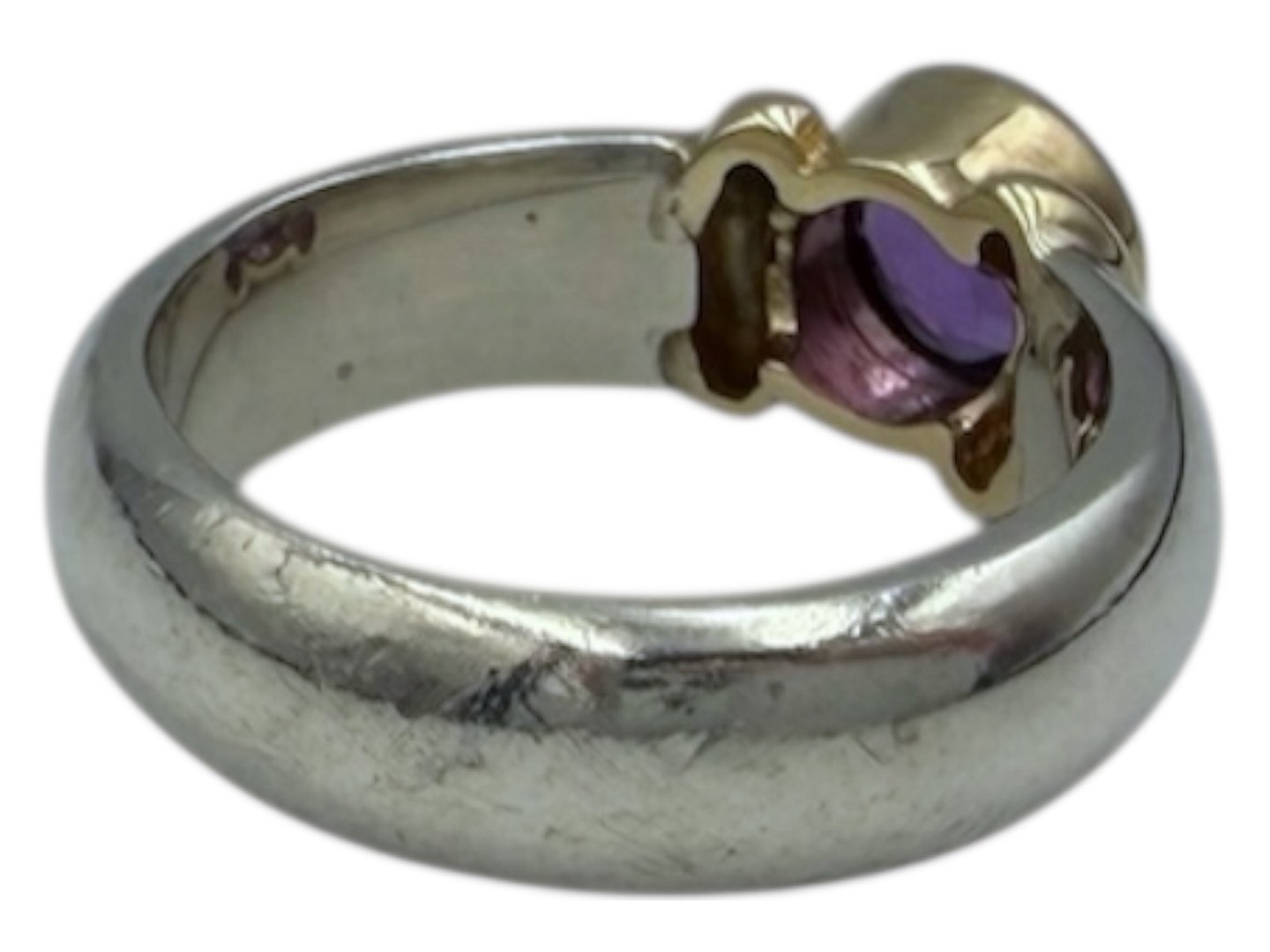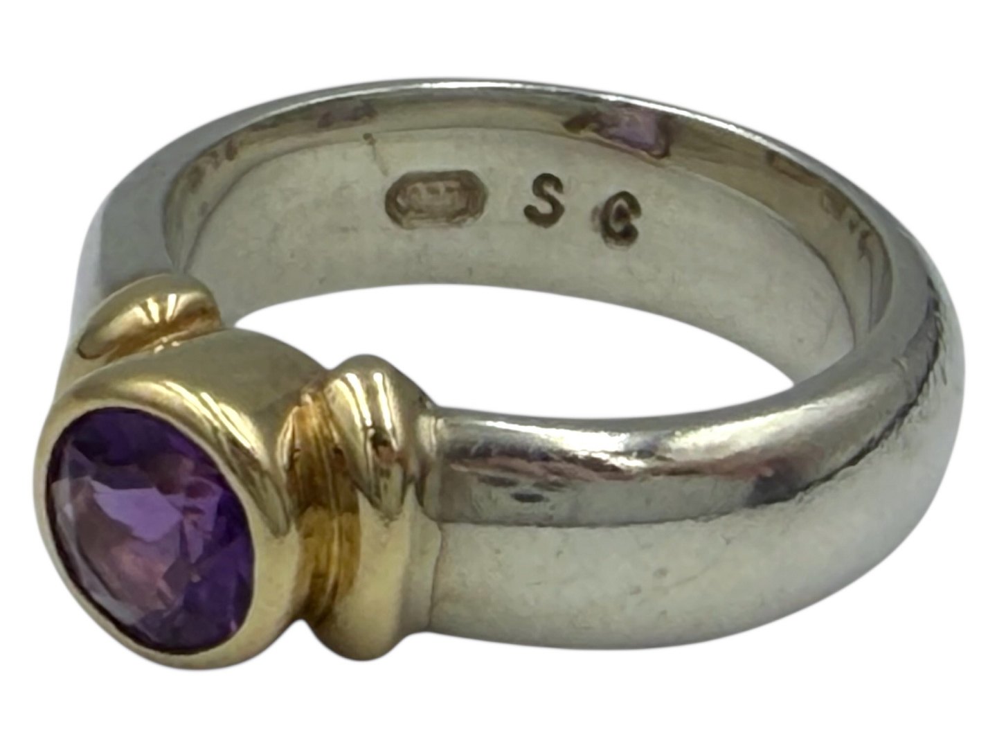 Sterling silver and 14 carat gold, ring with purple stone in a heavy quality.