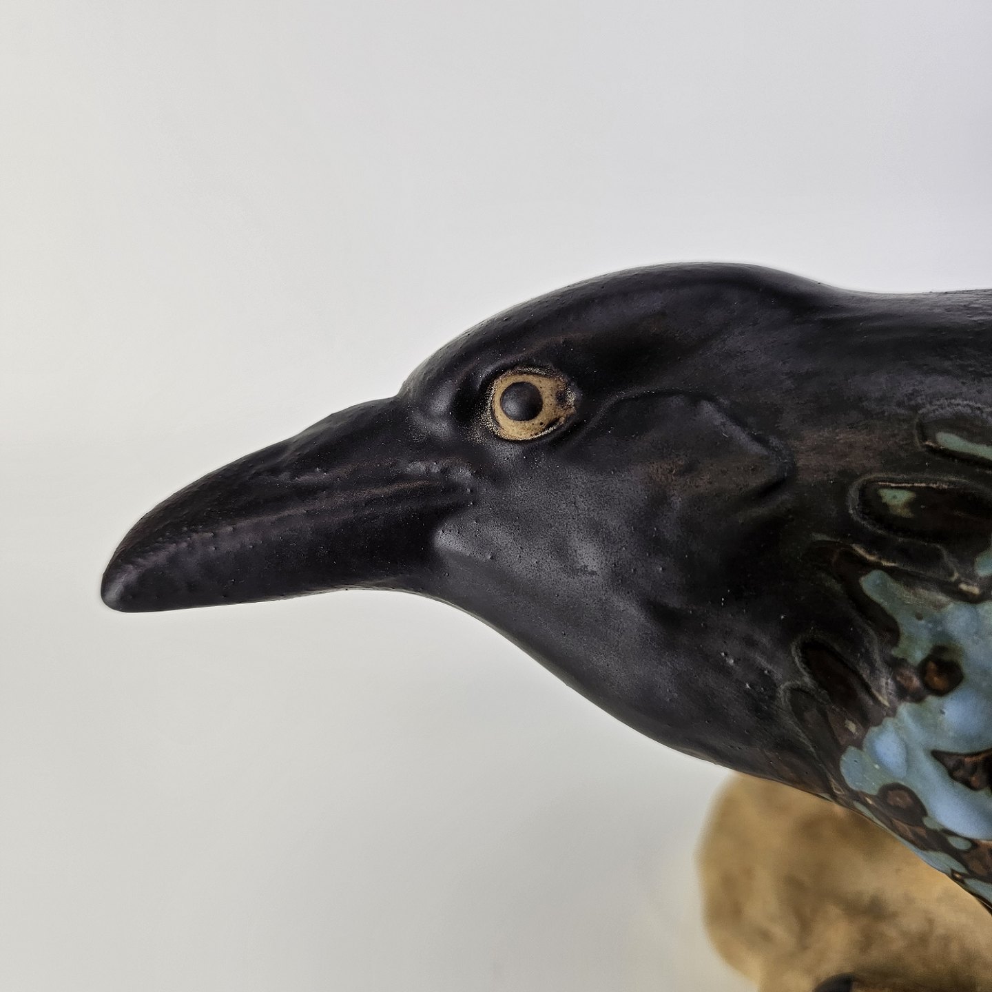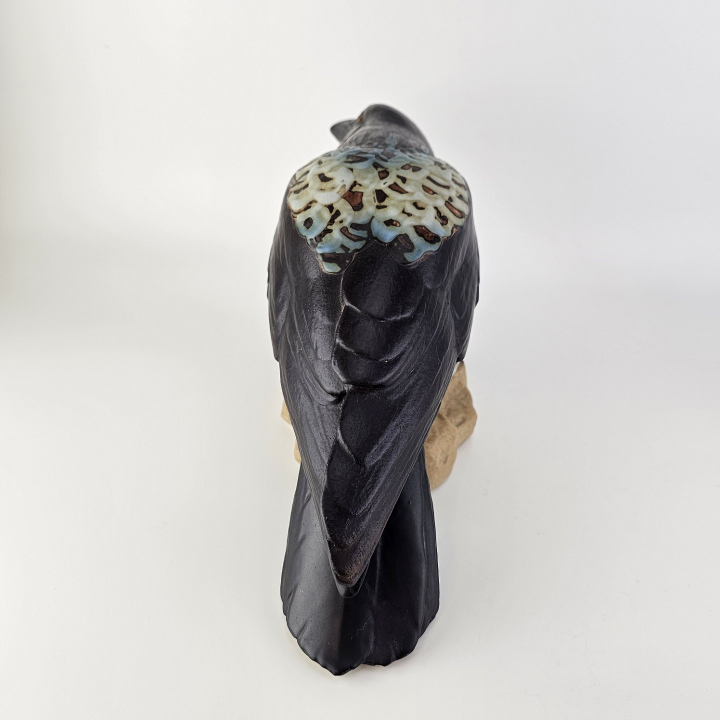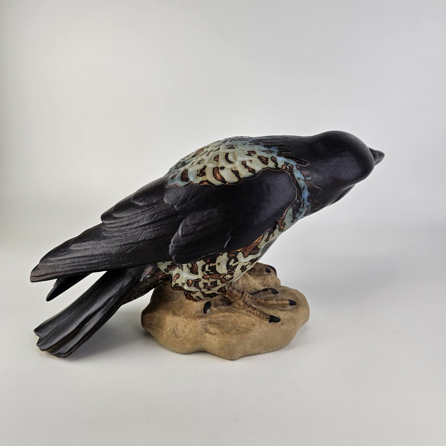 Figur i stentøj med motiv af en krage på en sten