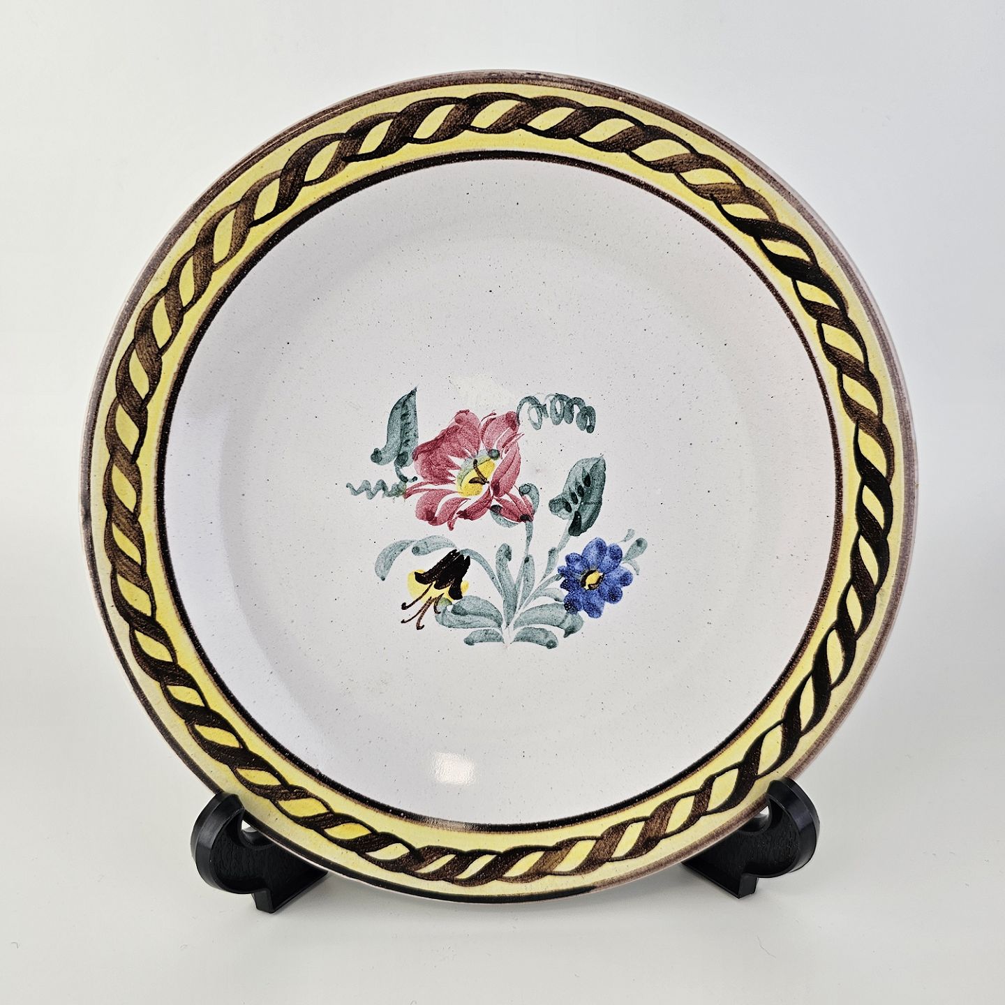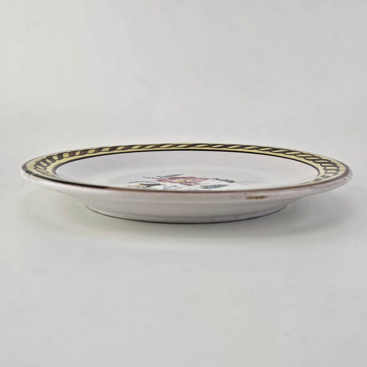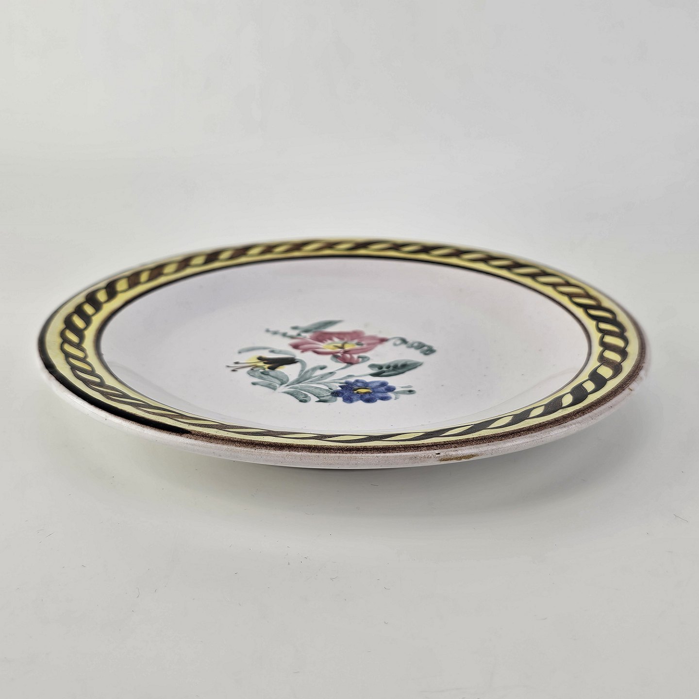 Desserttallerken i keramik med gule detaljer og blomsterdekoration