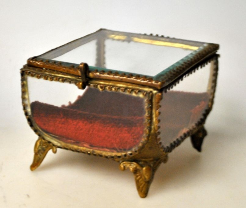 Jewelry box, France, circa 1900. With faceted glass and decorated brass frames and four legs. 8.5 x 8.5 x 7 cm.