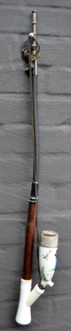 Danish porcelain soldier's pipe, 1878, Copenhagen. Painted white porcelain. Painted with the text: Søren Villadsen, 8 Batl. 4 Comp. N: 431. Remembrance from the camp in Dyrehaven. With a pipe of turned wood and braided horsehair. With iron grate at the mouth of the pipe. Mouthpiece of horn. L.: 70 cm.