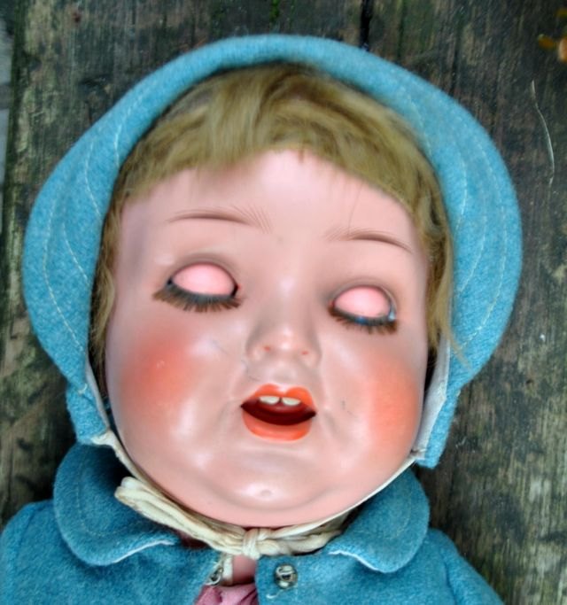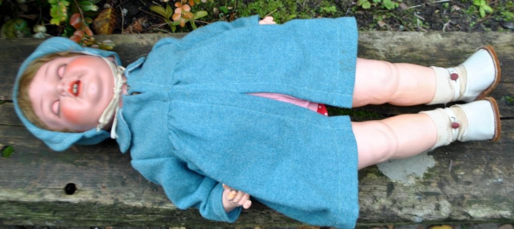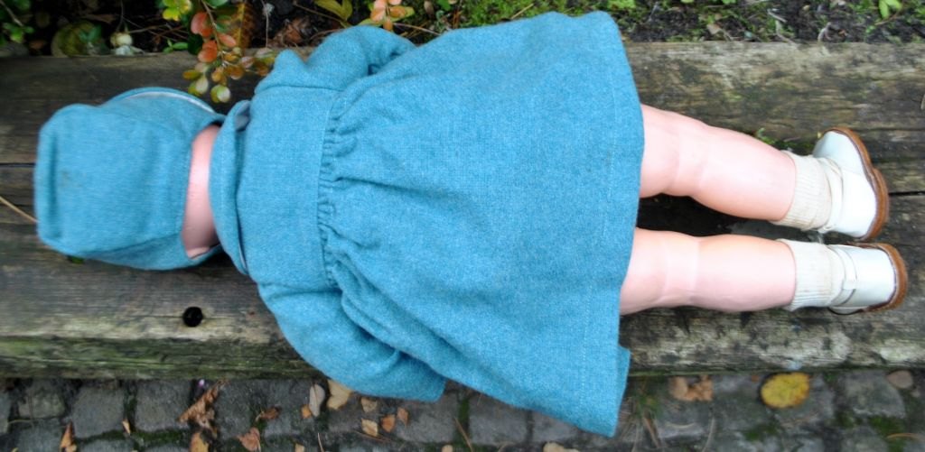 Large Heubach - Köppelsdorf doll 342.4 1/2, 20th century. Germany. Stamped. Head and body of composite material. Blue eyes that can open and close, with lashes of hair. Clothes in wool and shoes in patent leather and leather soles. L: 60 cm.