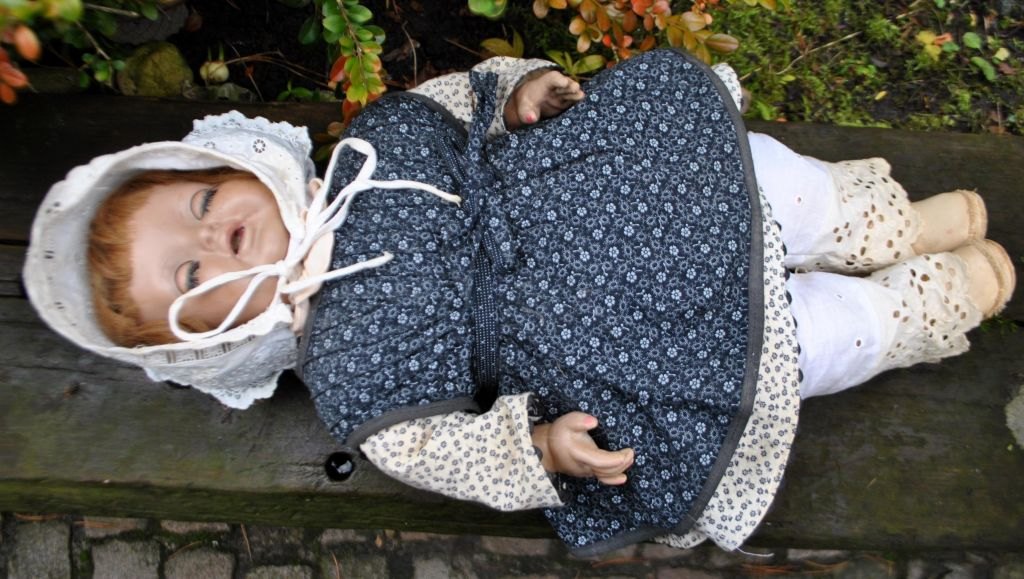 Antique doll with sound, 19th century. Germany. Head and limbs in composite material. Body in canvas. Blue eyes that can open and close with lashes of hair. Can make sounds when rocked. Cotton clothes and patent leather shoes. L: 48 cm.