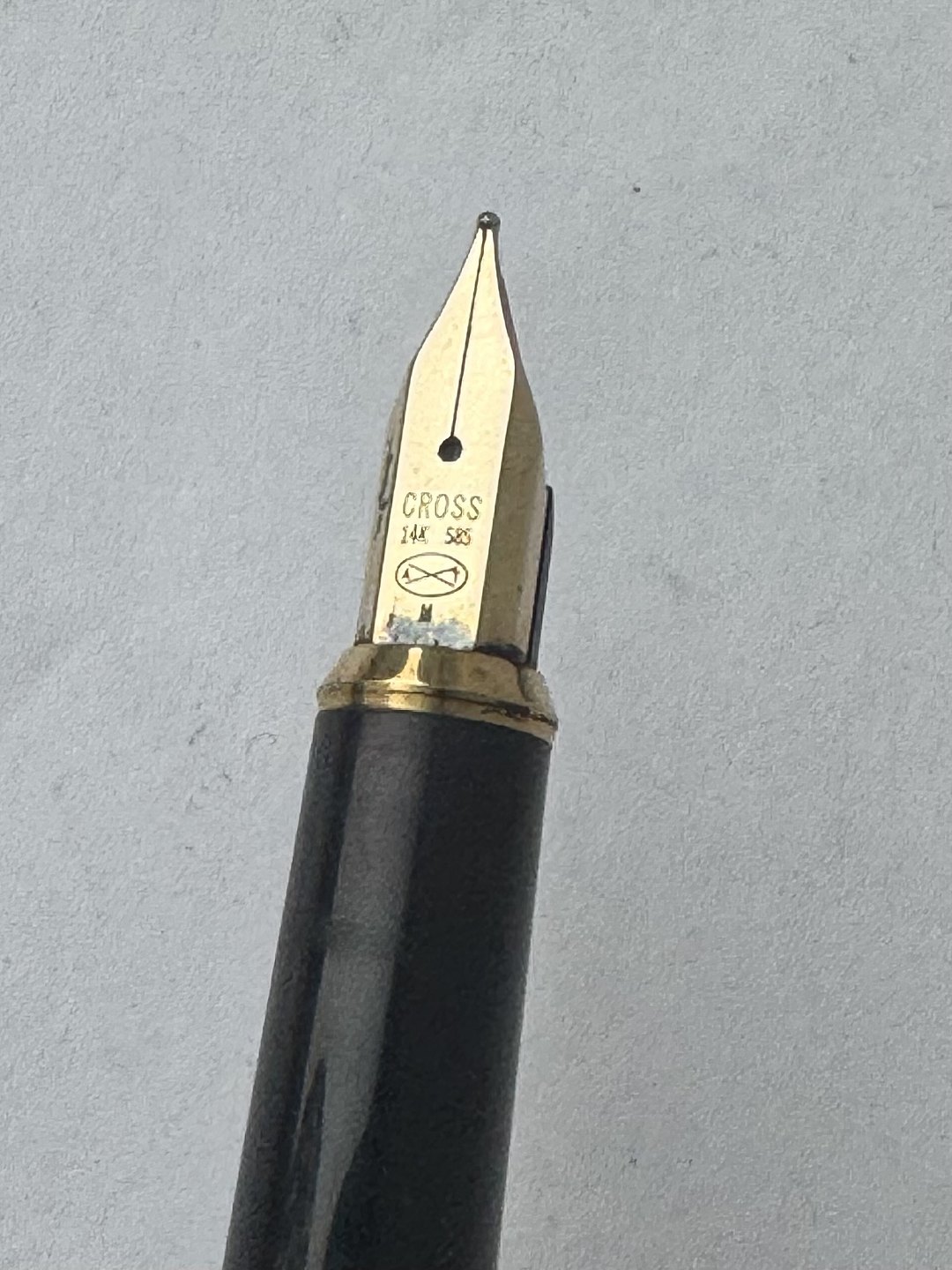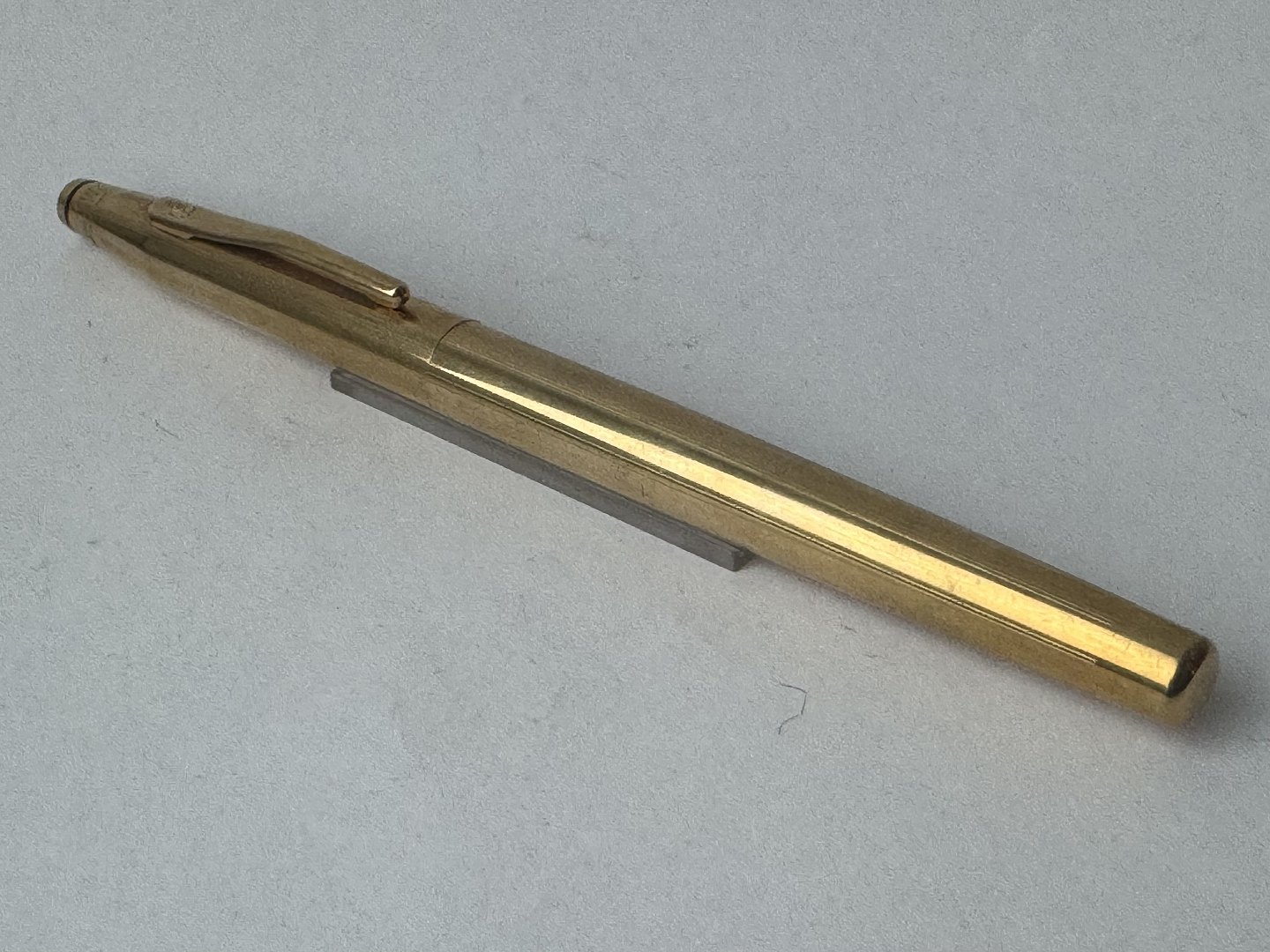 Cross fountain pen in gold-double with piston filler ink filling system. All parts original including a 14 carat gold nib. Appears in good condition and ready to be used. L. 13.4 cm