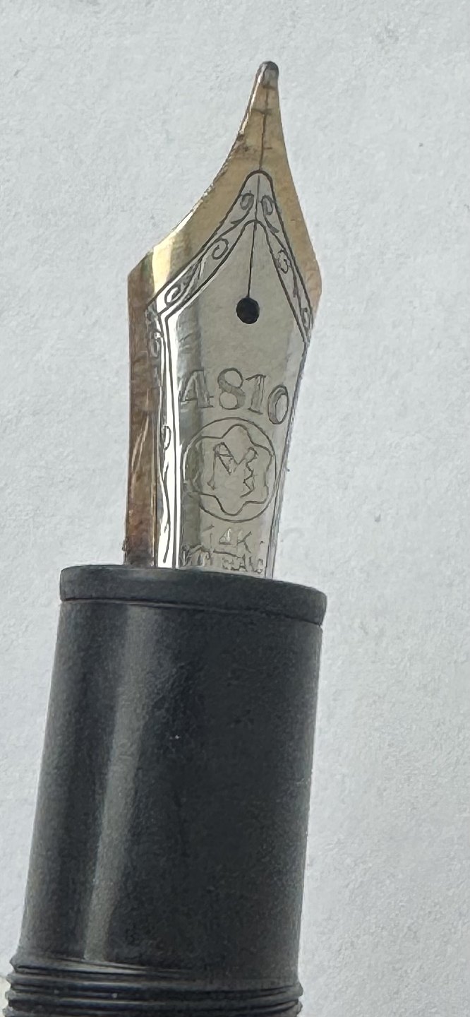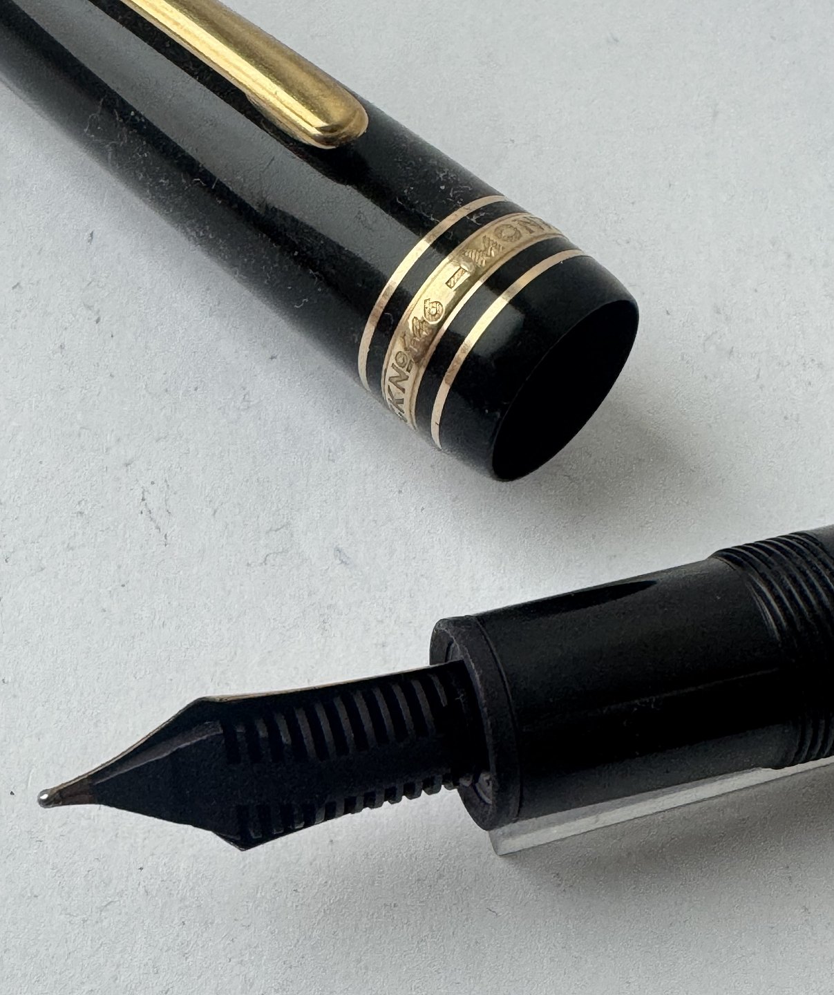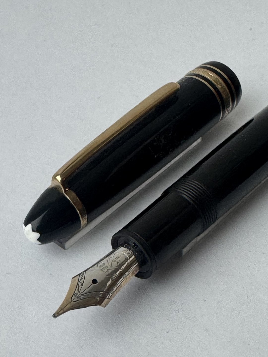 Black Montblanc Meisterstück LeGrand fountain pen with all original Montblanc parts including a large 14 carat gold nib. Ink filling with piston filler. In good condition and ready to be use. L. 14.3 cm.