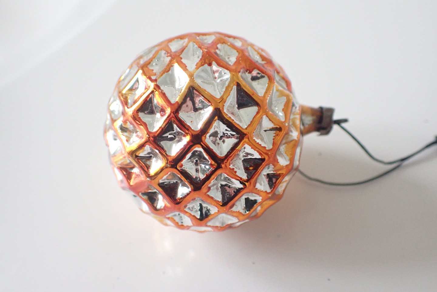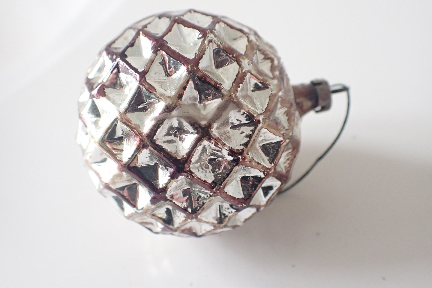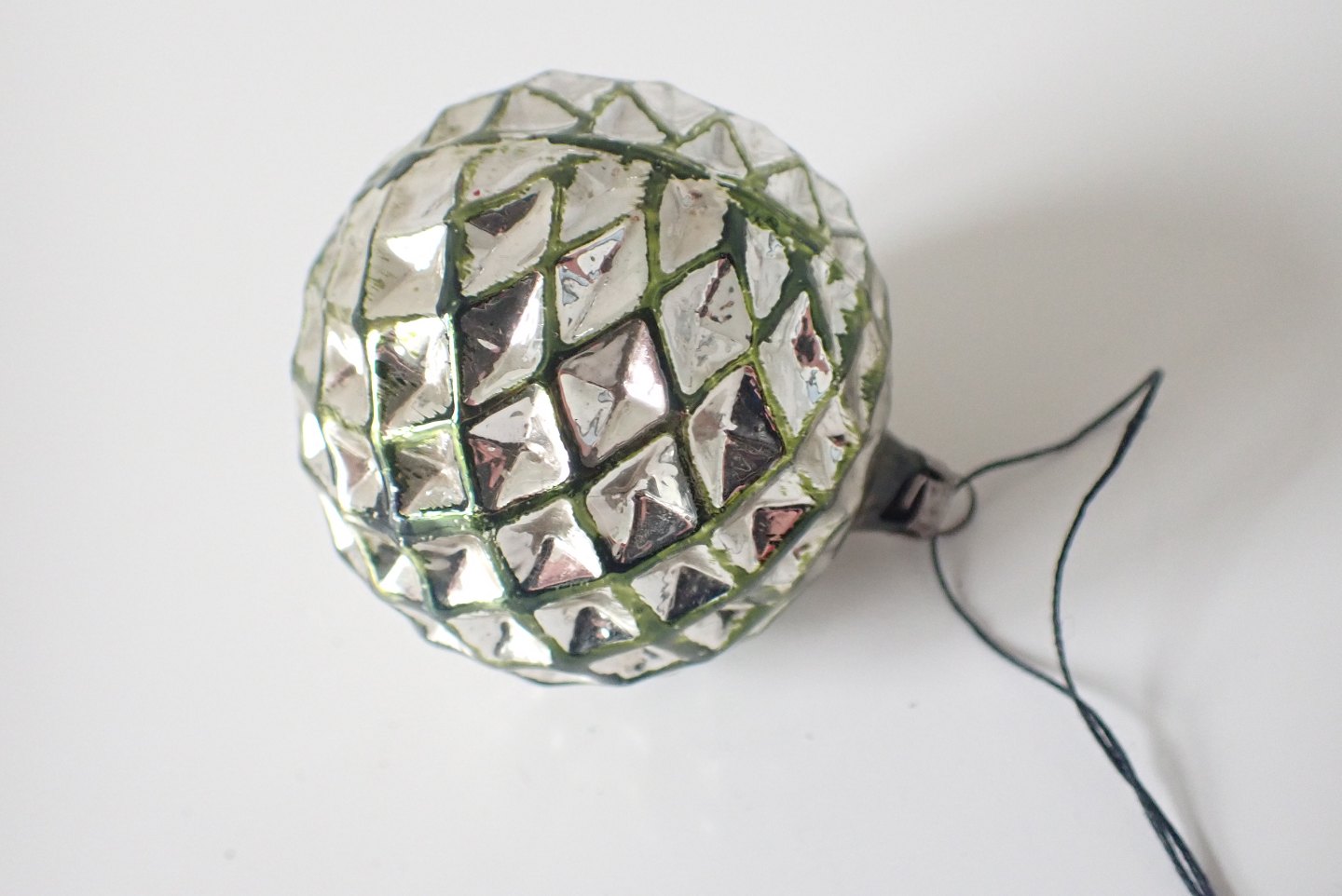 Text available in Danish: 3 stk. glasjulepynt - "golfbolde" kugler med mange små reflektorer. Sælges individuelt.