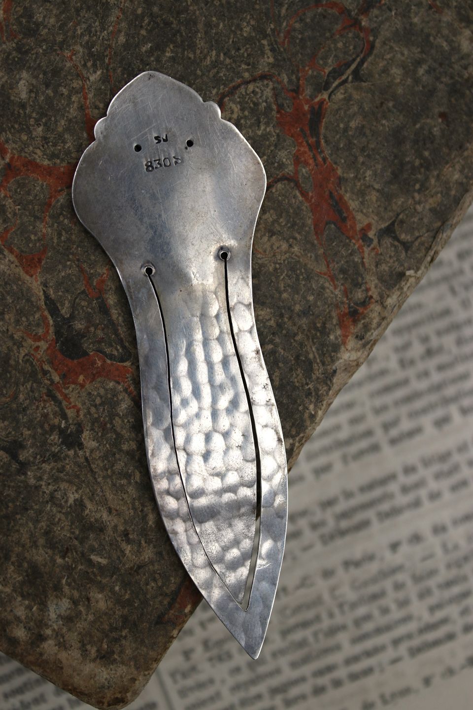 Old bookmark in silver, stamped 830s (initials JN) with the French lily motif. Height: 8.6cm.