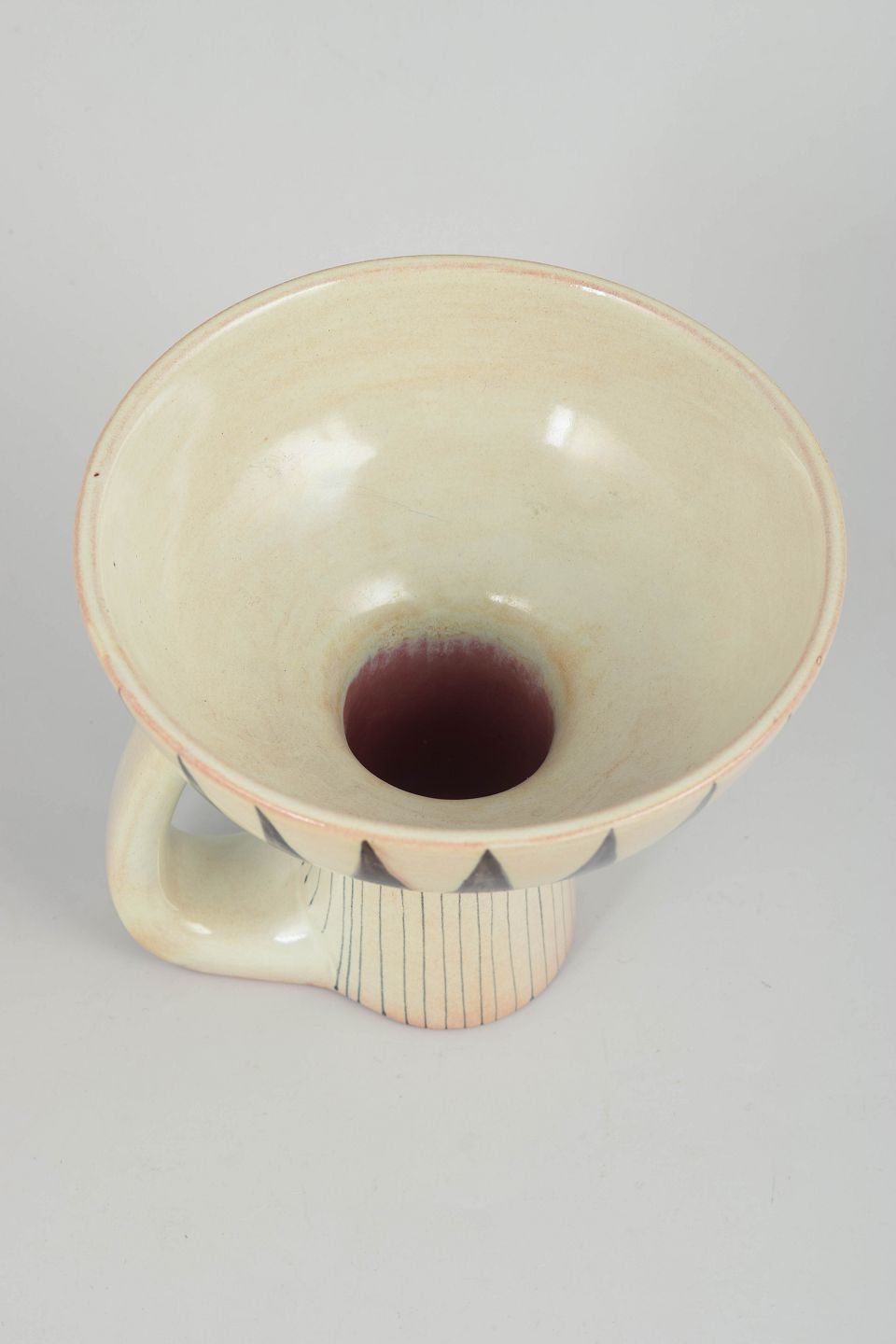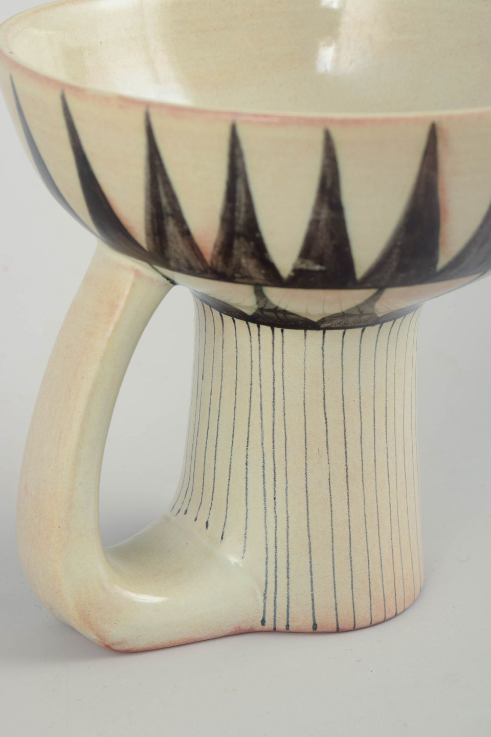 Sculptural stoneware vase with pronounced foot and side handle. Decorated with incised vertical line work and a contrasting black graphic band around the rim. The softly toned glaze and balanced proportions are characteristic of Stålhane’s work at Rörstrand during the 1960s.
