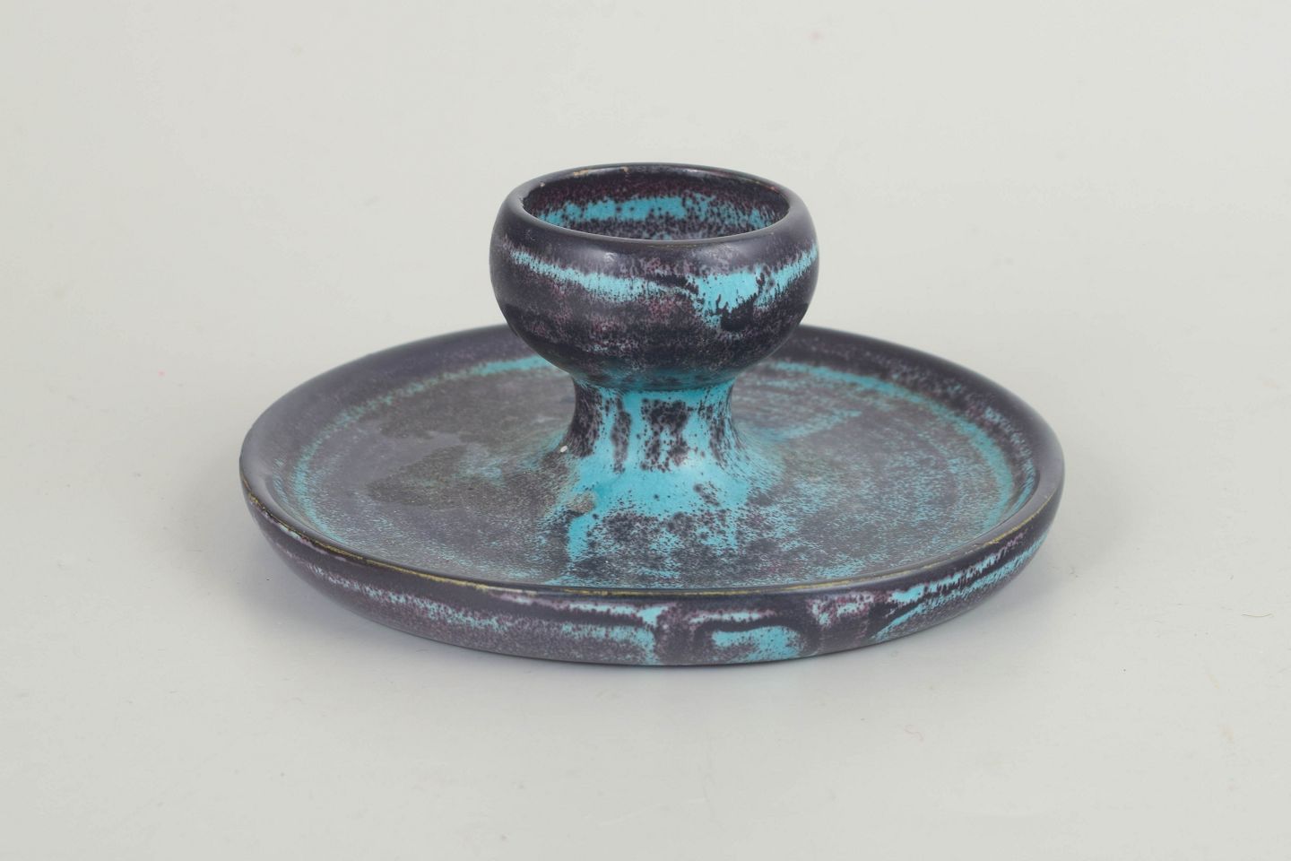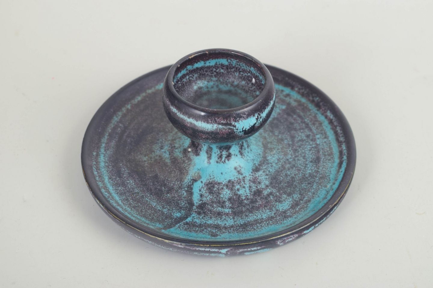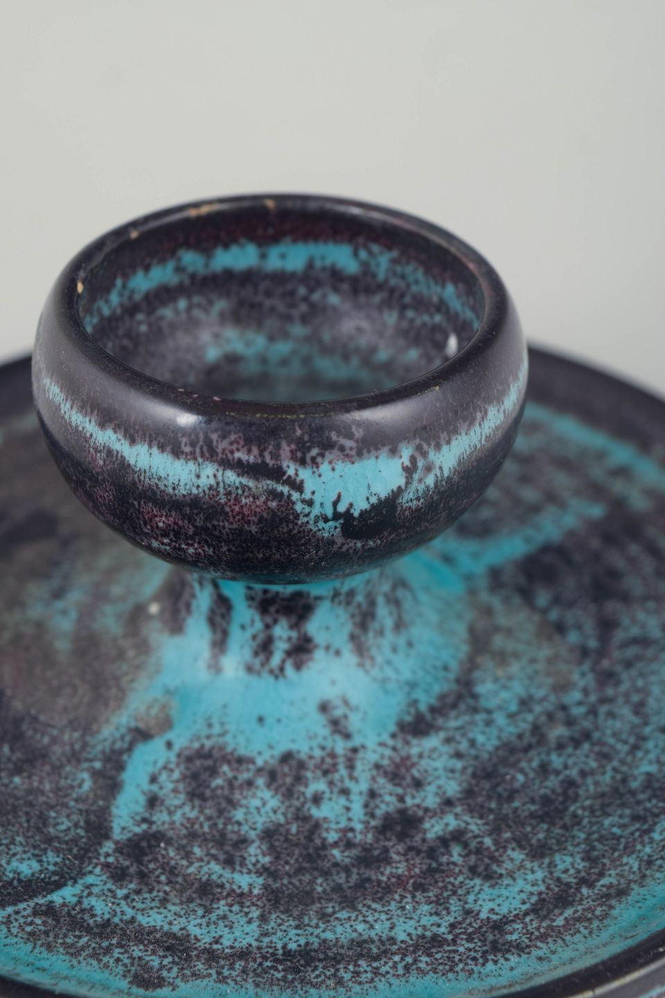Low, circular stoneware candlestick with a centrally positioned candle holder and a wide, well-balanced base. Finished in a characteristic green and black double glaze with a lively, subtly metallic surface that flows across the form and emphasizes its calm, weighty presence. A classic example of Svend Hammershøi’s functional and architectural design language from the interwar period.