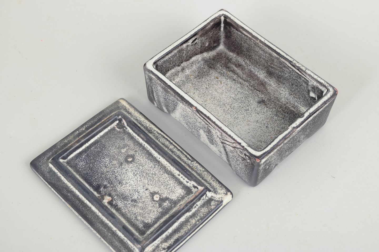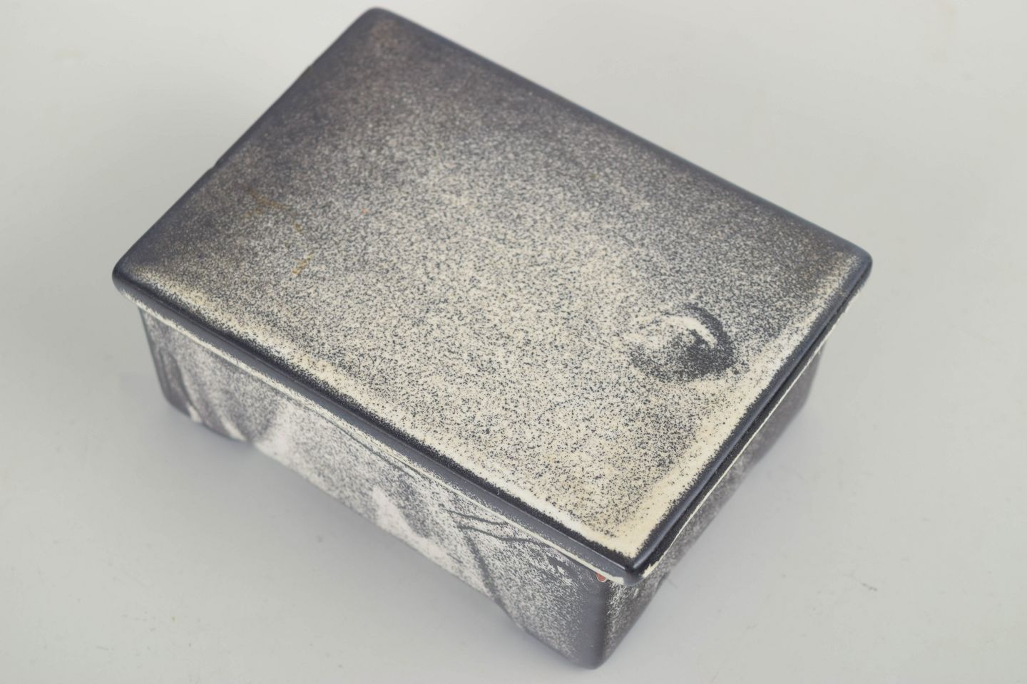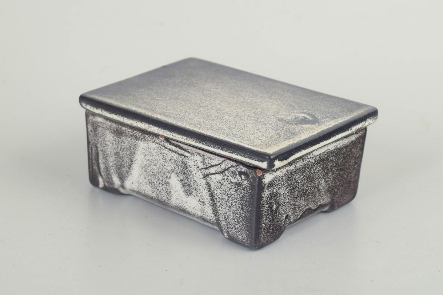 Rectangular stoneware box with fitted lid, finished in a characteristic grey and black double glaze with a subtle metallic effect. The strict, architectural form and tactile glaze surface are typical of Svend Hammershøi’s work for Kähler during the interwar period, combining function and aesthetics in a restrained, timeless expression.