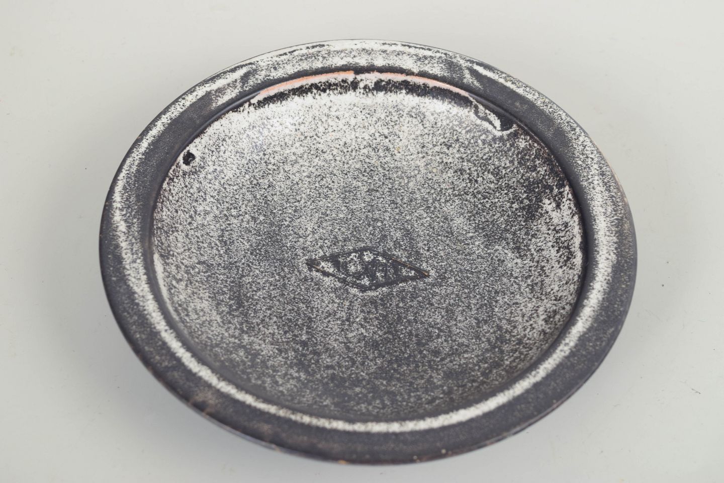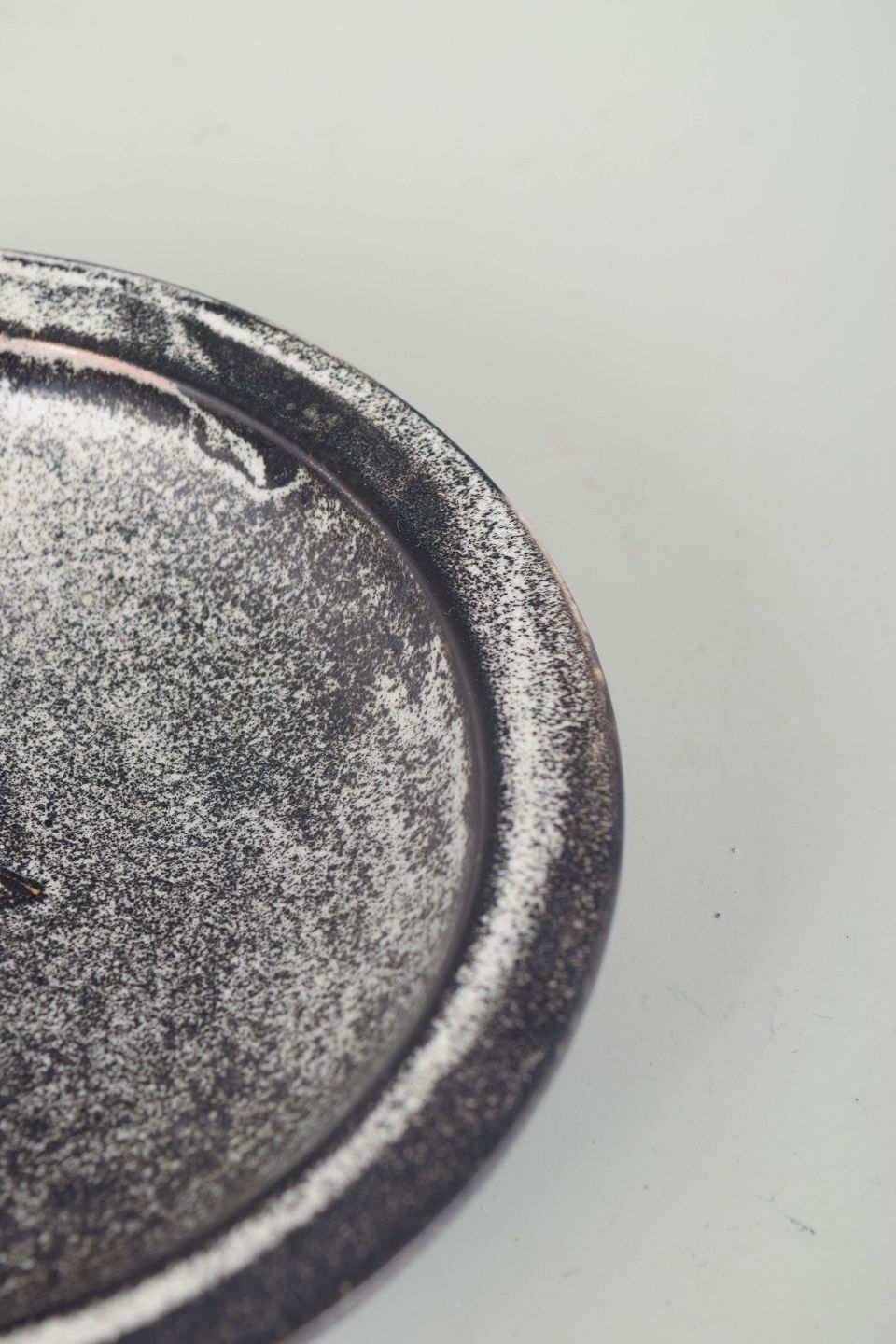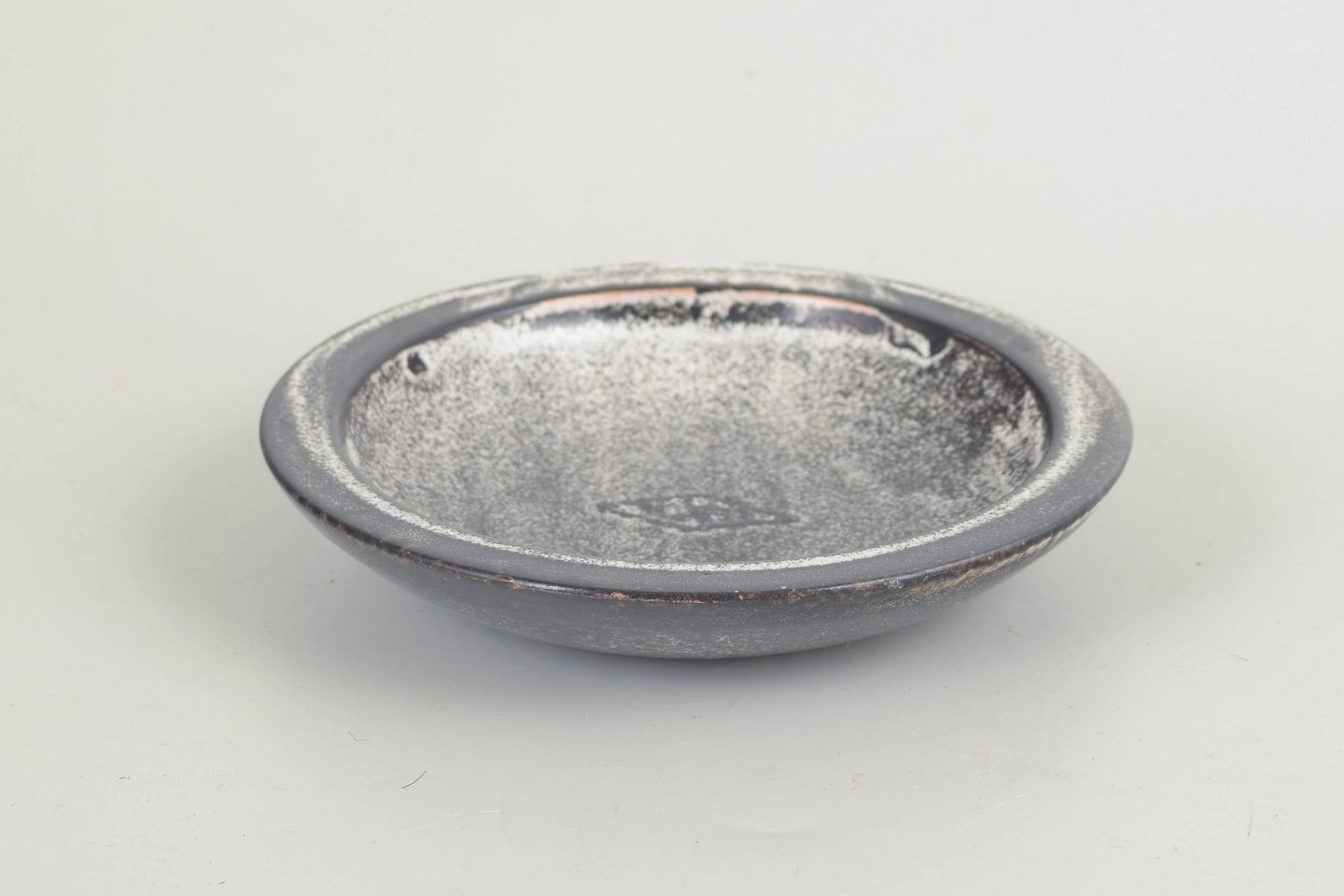 Low, circular stoneware dish with a pronounced rounded rim and a distinctive grey and black double glaze. The subtly metallic surface and restrained, well-balanced form are characteristic of Svend Hammershøi’s work for Kähler during the interwar period, where material quality and glaze depth are key elements.