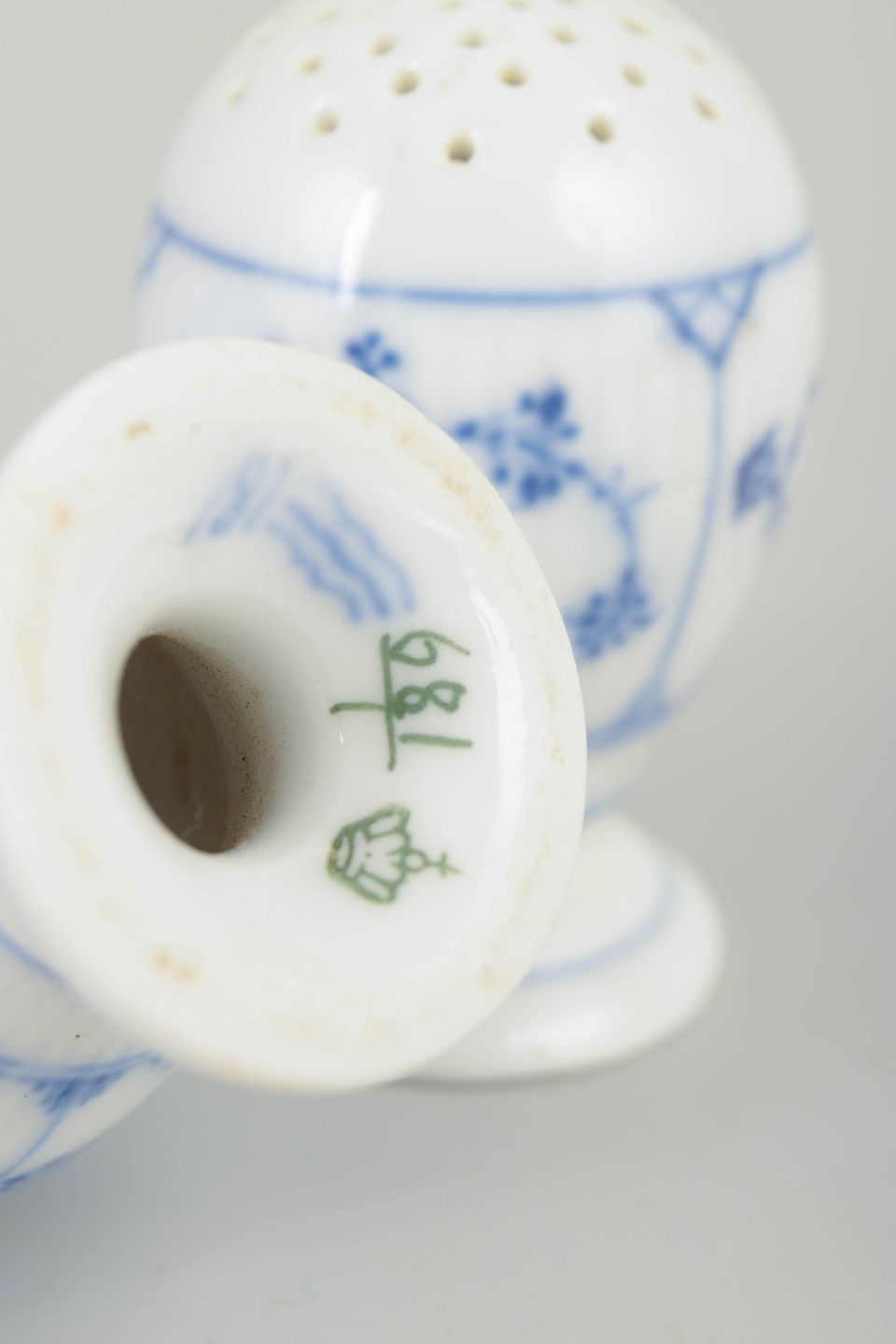 Antique salt and pepper set in the Blue Fluted Plain pattern, made in the classic smooth form without lace border and decorated with hand-painted cobalt blue underglaze. The baluster-shaped shakers with pierced tops stand on small pedestal bases and represent an elegant and functional table accessory from the turn of the century.