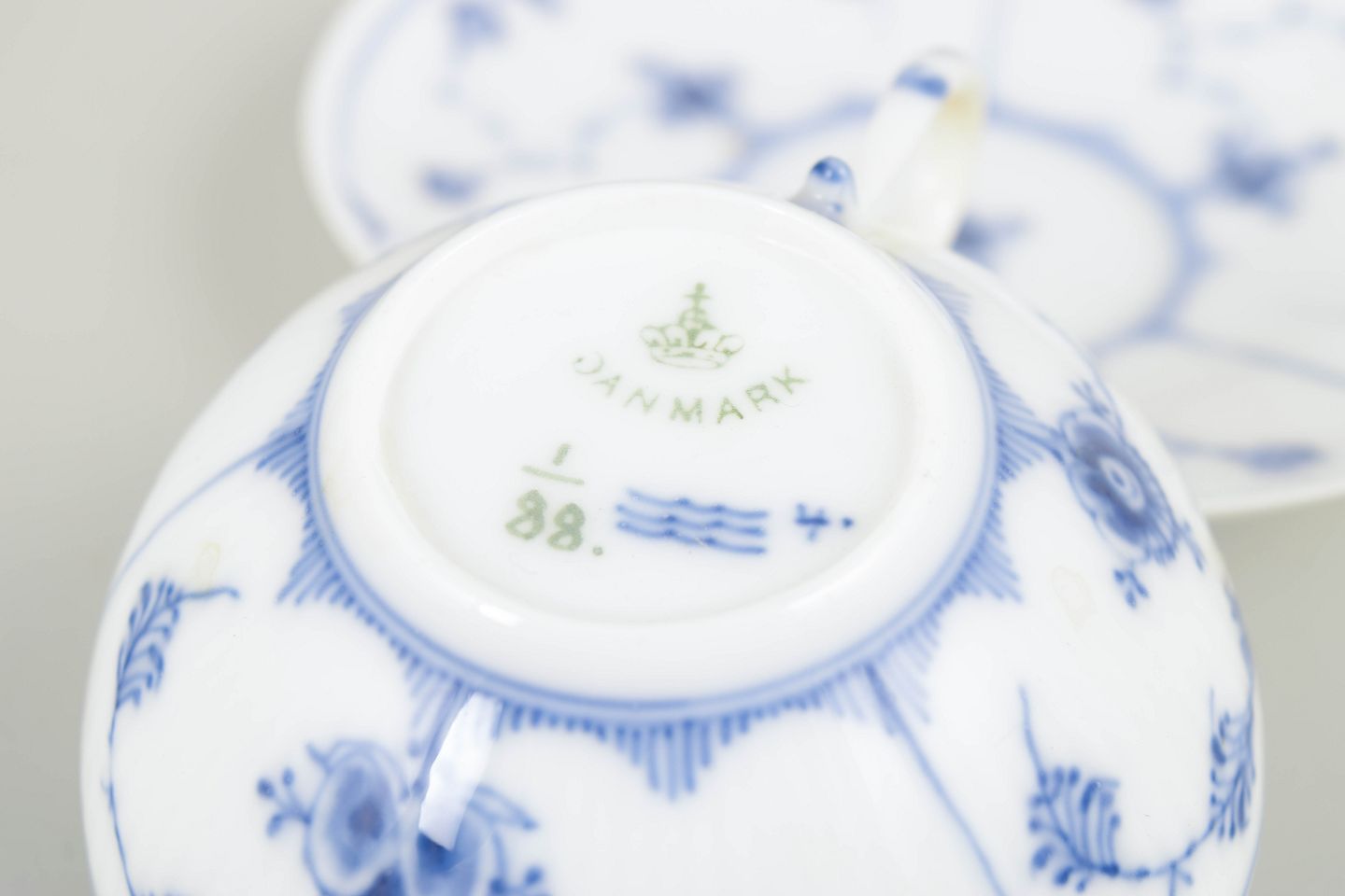 Antique demitasse cup with matching saucer in the Blue Fluted Plain pattern. The cup is made in the classic smooth form without lace border and decorated with hand-painted cobalt blue underglaze in the iconic fluted pattern. A refined early example of Royal Copenhagen coffee ware from the late 19th century.