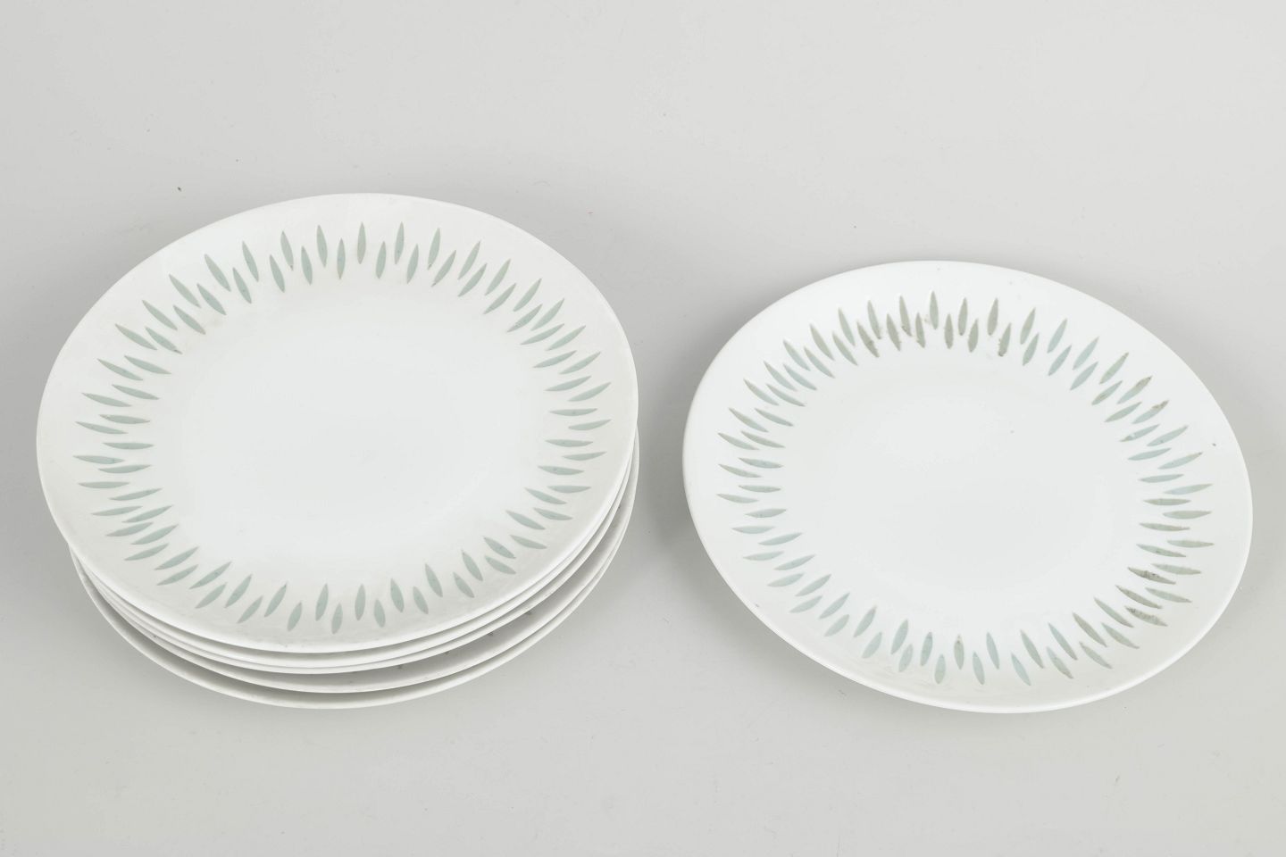 Set comprising six plates in white porcelain decorated with characteristic “rice porcelain” ornamentation along the rim. The elongated transparent glaze areas form a light, rhythmic border, giving the plates an elegant and airy appearance. The restrained design language is typical of Friedl Holzer-Kjellberg’s later porcelain production for Arabia.