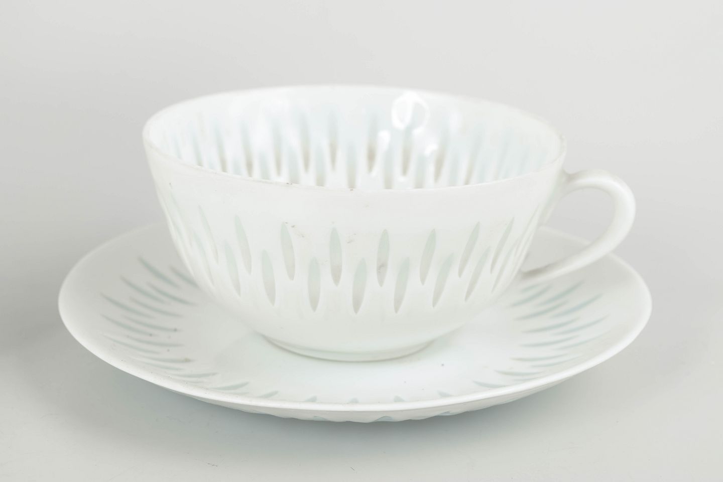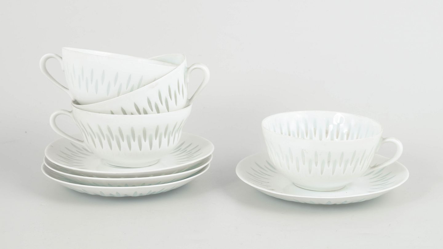 Set comprising four tea cups with matching saucers in white porcelain with pierced “rice porcelain” decoration. The elongated perforations filled with transparent glaze create a light and almost translucent appearance, while the simple rounded forms are characteristic of Friedl Holzer-Kjellberg’s later modernist porcelain designs for Arabia.