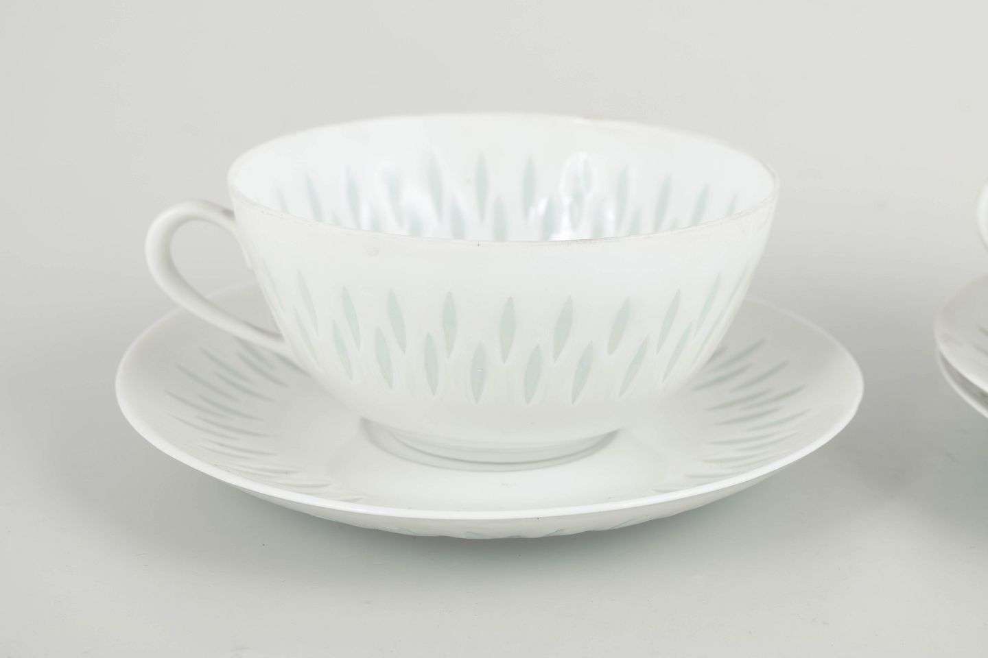 Set comprising three tea cups with matching saucers in white porcelain with pierced “rice porcelain” decoration. The elongated perforations filled with transparent glaze create a light and almost translucent appearance, while the simple rounded forms are characteristic of Friedl Holzer-Kjellberg’s later modernist porcelain designs for Arabia.