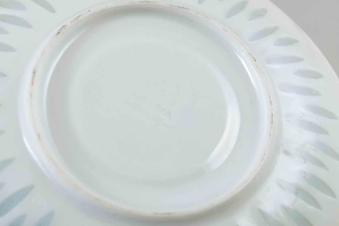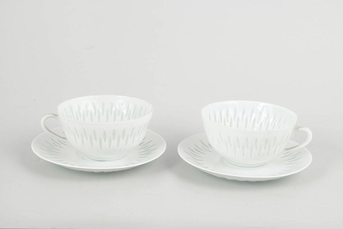 Set comprising two tea cups with matching saucers in white porcelain with pierced “rice porcelain” decoration. The elongated perforations filled with transparent glaze create a light and almost translucent appearance, while the simple rounded forms are characteristic of Friedl Holzer-Kjellberg’s later modernist porcelain designs for Arabia.