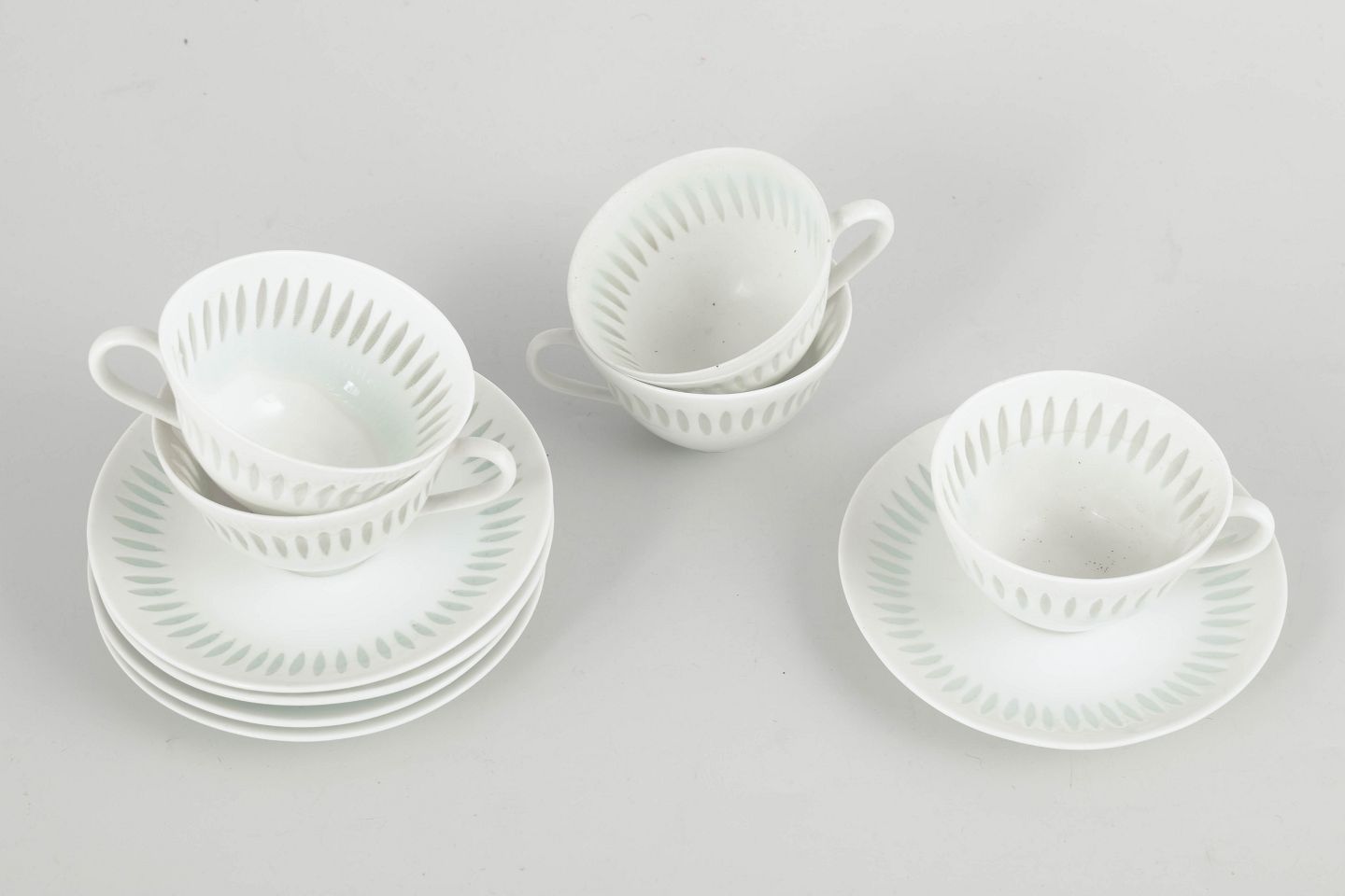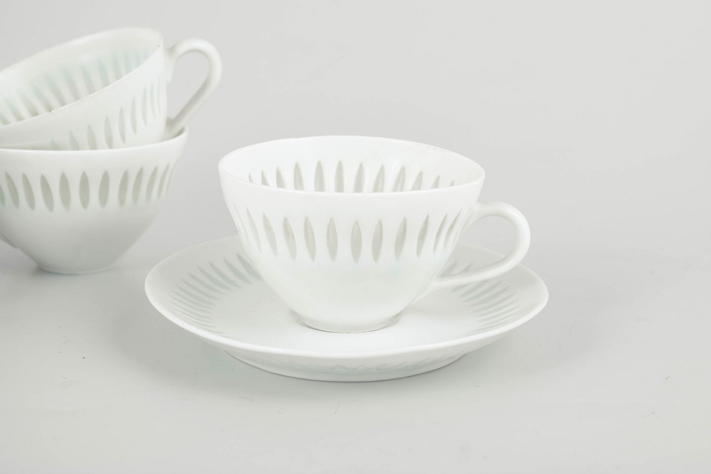 Larger set comprising five demi-tasse coffee cups with matching saucers in white porcelain with pierced “rice porcelain” decoration. The fine elongated perforations filled with transparent glaze create a light, almost translucent appearance. The simple, well-balanced forms are characteristic of Friedl Holzer-Kjellberg’s later modernist designs for Arabia.