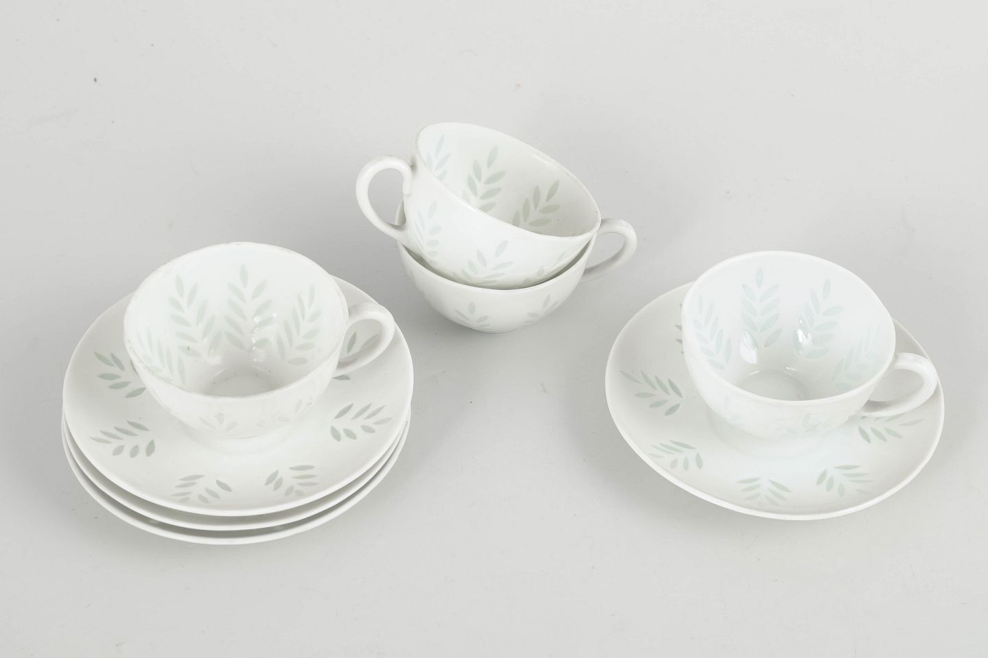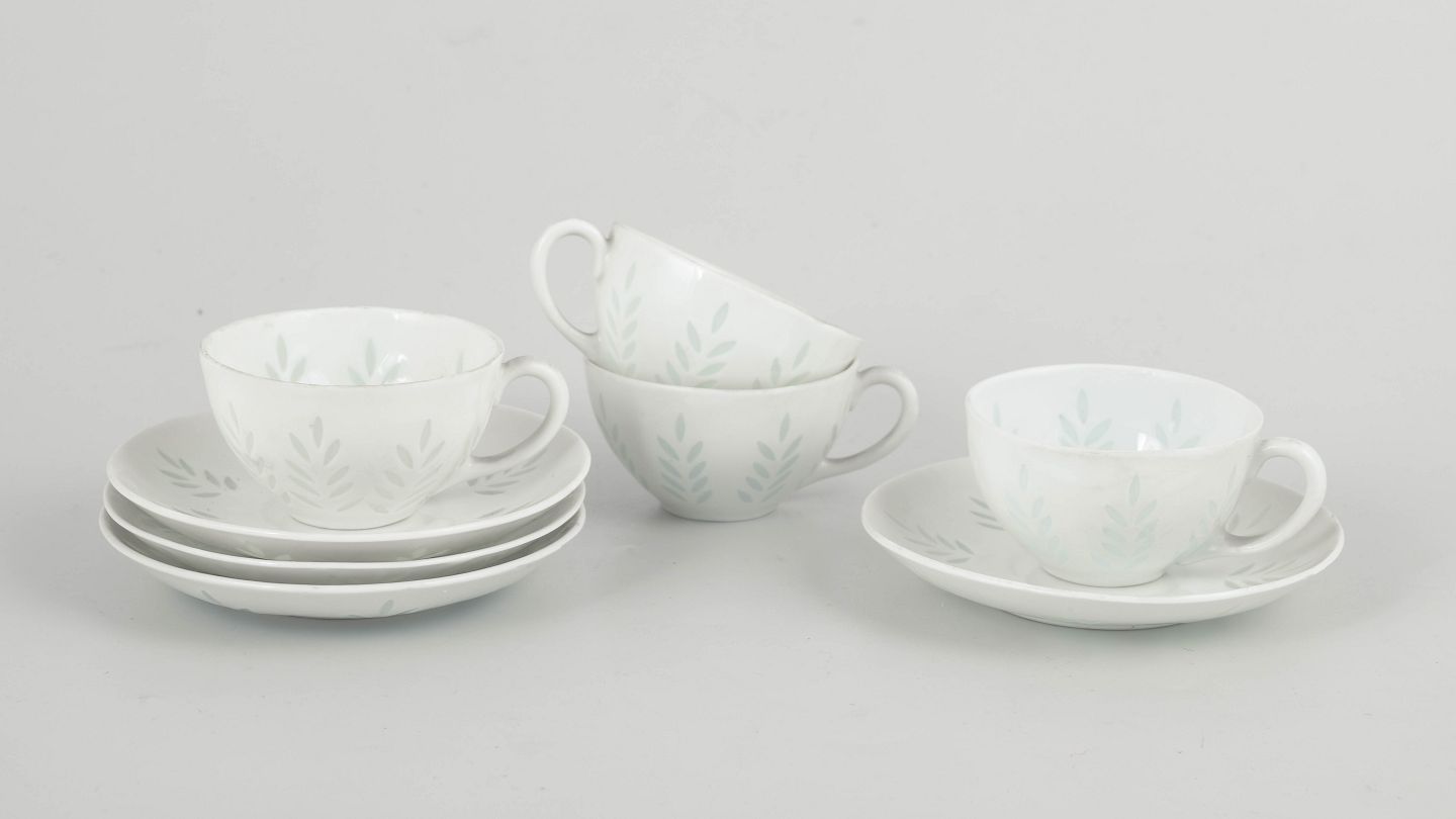 Elegant set comprising four demi-tasse coffee cups with matching saucers in white porcelain, decorated with a subtle leaf motif executed in transparent, lightly green-tinted glaze areas. The light and harmonious appearance combined with softly rounded forms is characteristic of Friedl Holzer-Kjellberg’s later porcelain designs for Arabia.