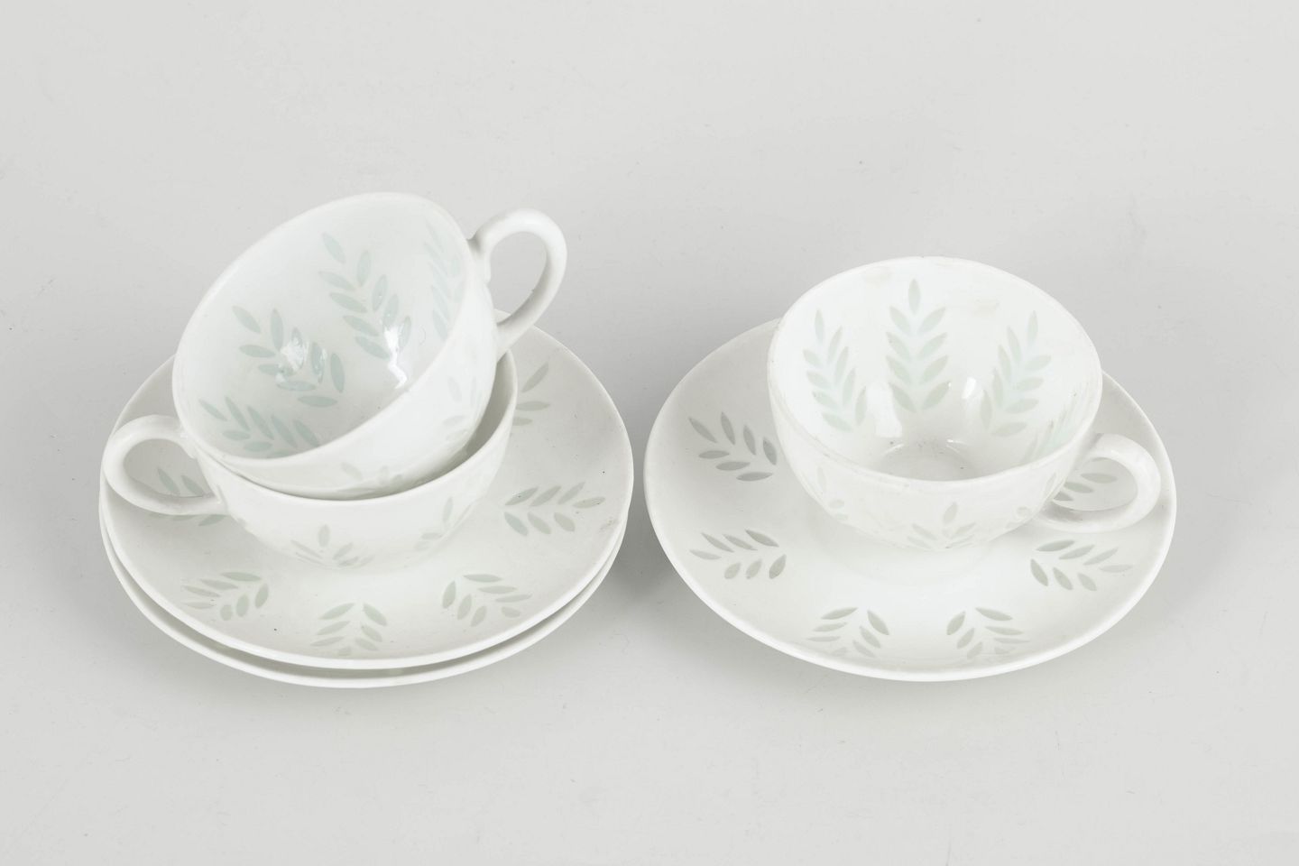 Elegant set comprising three demi-tasse coffee cups with matching saucers in white porcelain, decorated with a subtle leaf motif executed in transparent, lightly green-tinted glaze areas. The light and refined appearance, together with softly balanced forms, is characteristic of Friedl Holzer-Kjellberg’s later porcelain designs for Arabia.