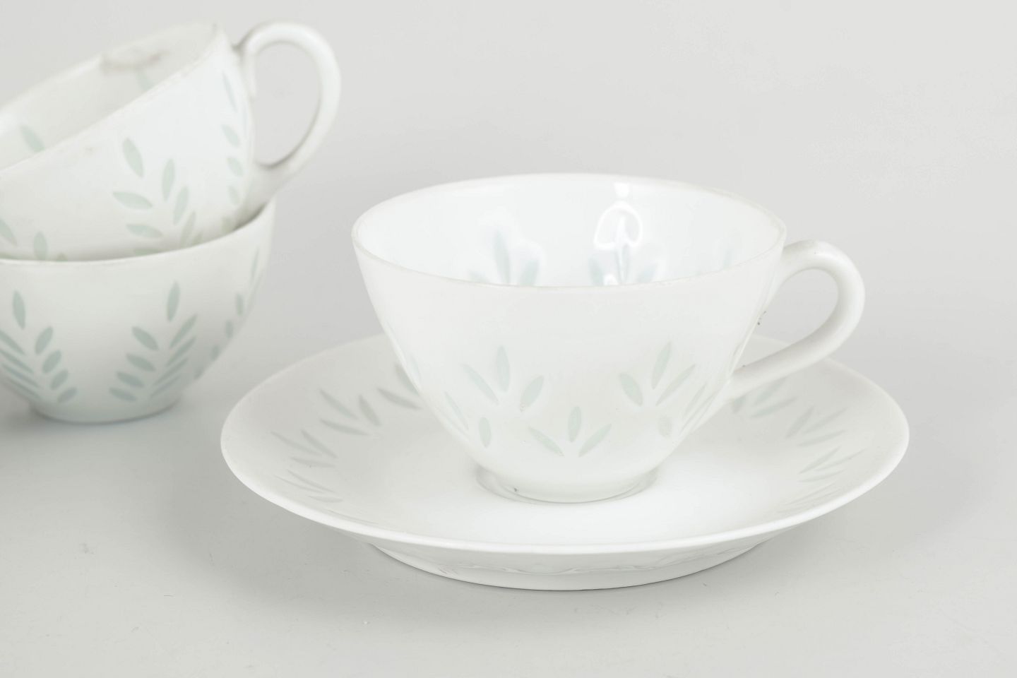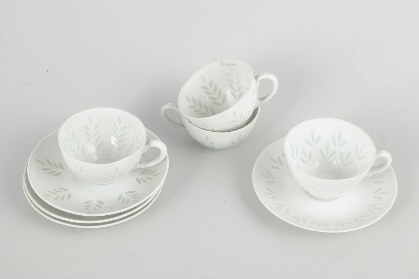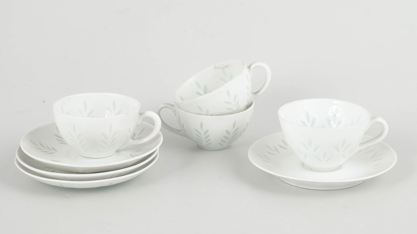 Elegant set comprising four demi-tasse coffee cups with matching saucers in white porcelain, decorated with a subtle leaf motif executed in transparent, lightly green-tinted glaze areas. The light, refined appearance and softly rounded forms are characteristic of Friedl Holzer-Kjellberg’s later porcelain designs for Arabia.