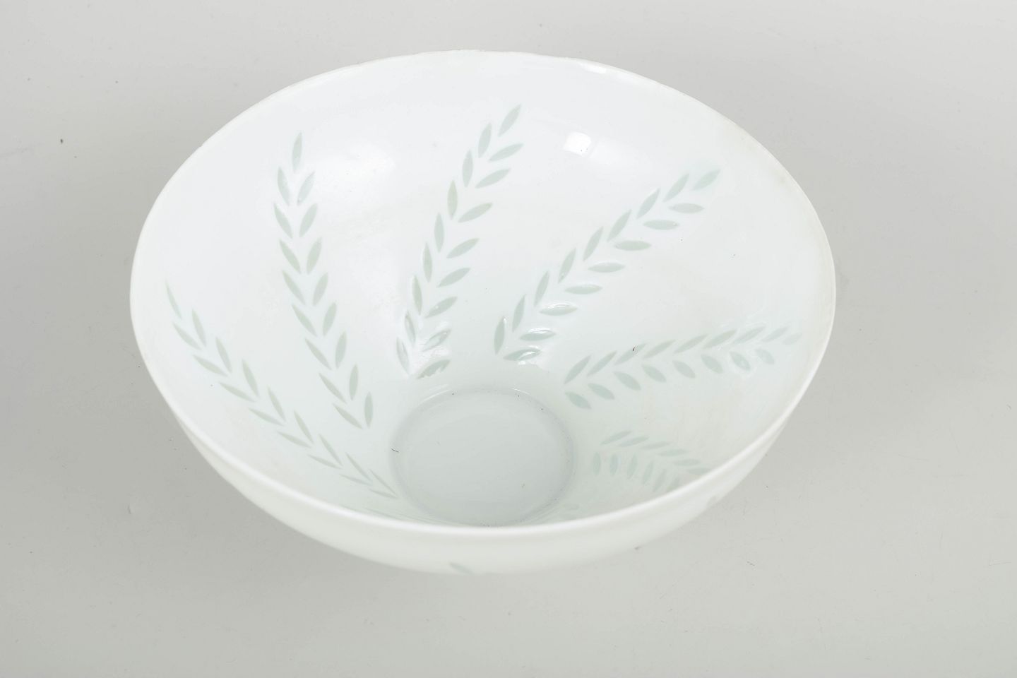 Large bowl in white porcelain with a subtle leaf motif executed in transparent, lightly green-tinted glaze areas. The simple conical form combined with restrained decoration gives the bowl a light and elegant appearance, characteristic of Friedl Holzer-Kjellberg’s modernist porcelain designs for Arabia.