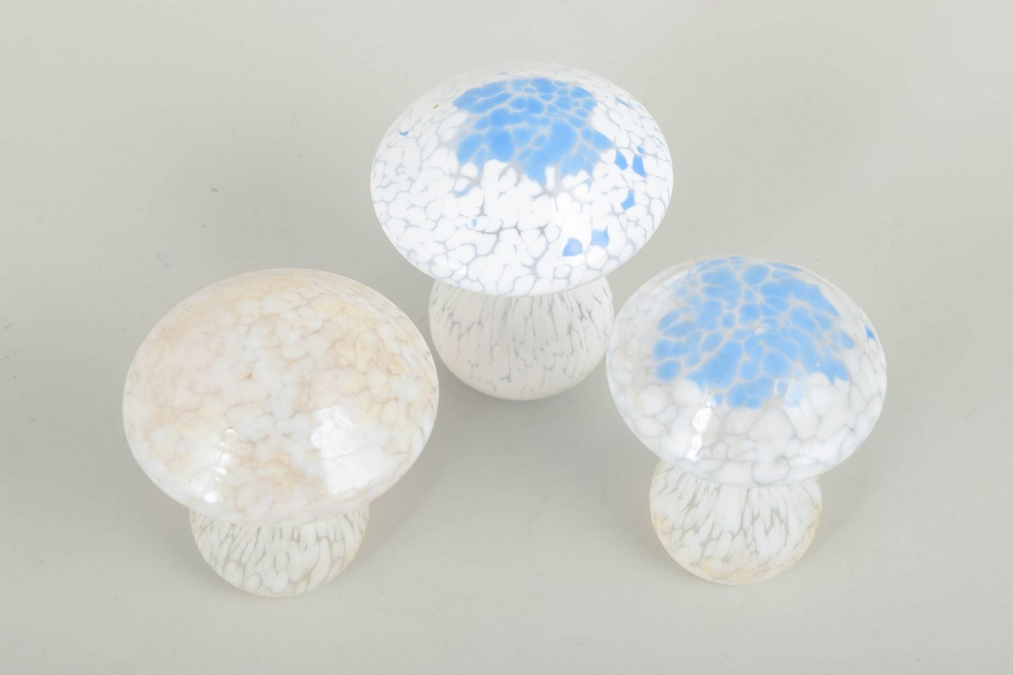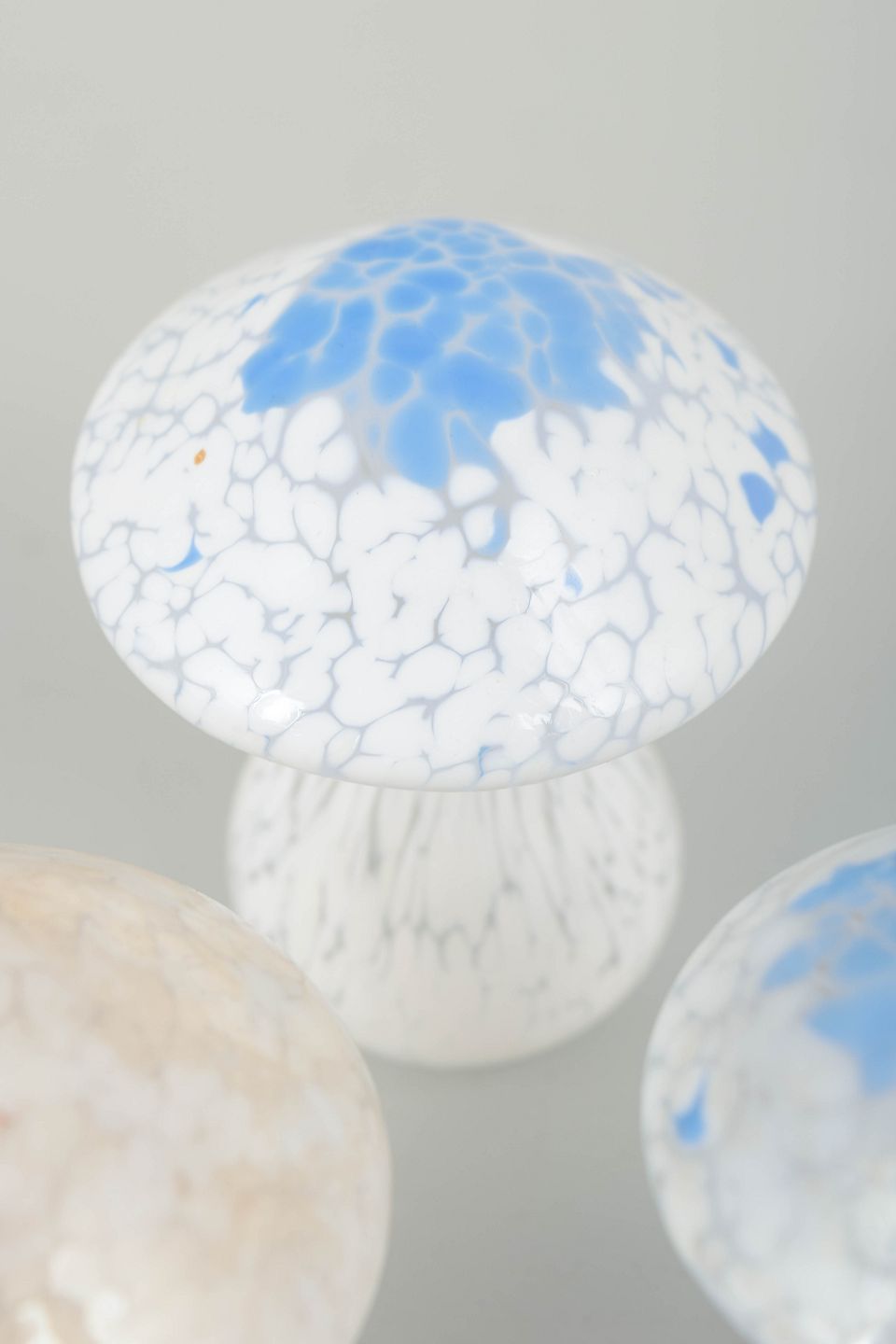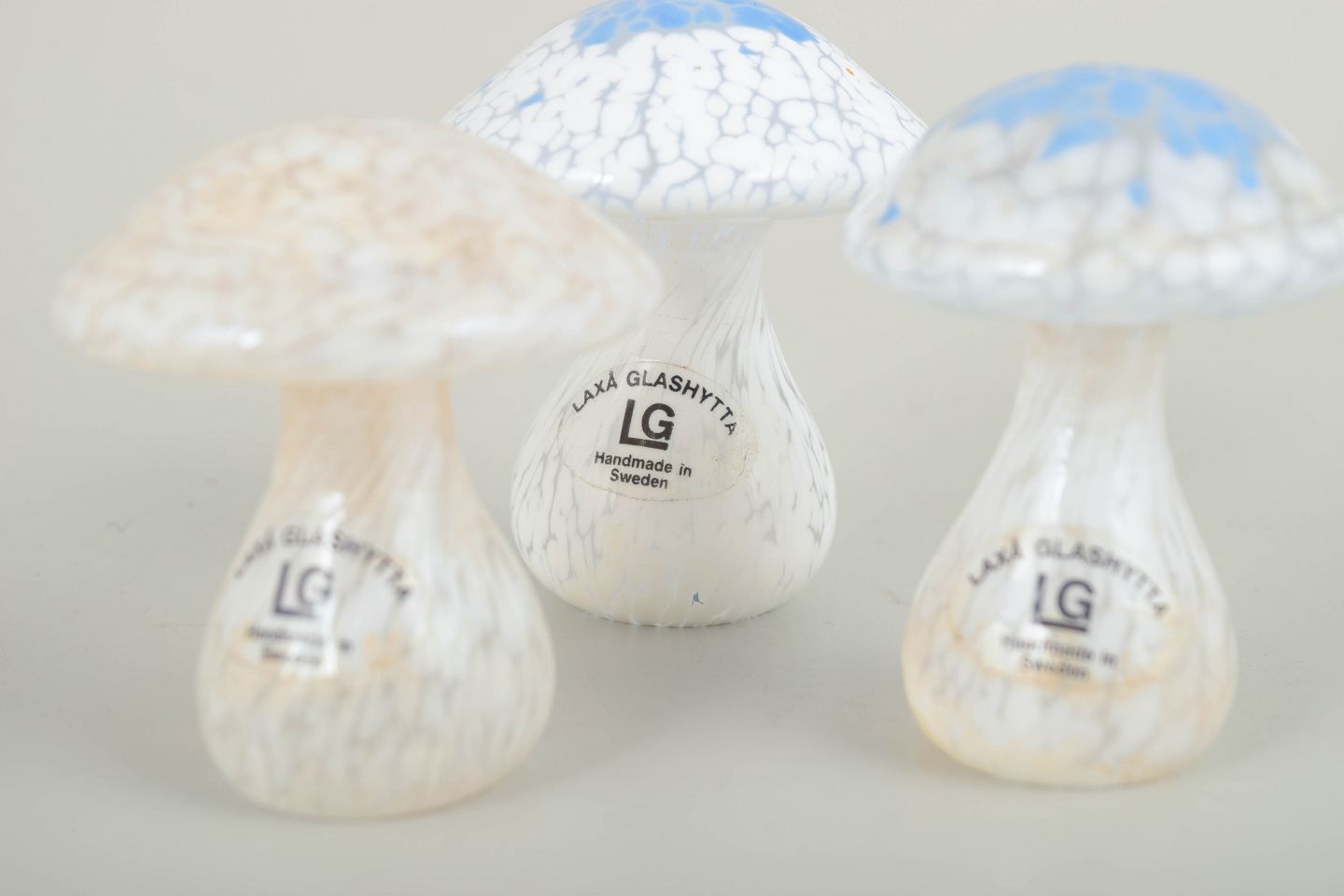 Set of three decorative mushrooms in mould-blown art glass with a crackled, slightly opalescent surface and blue/white tones. All pieces retain the original Laxå Glashytta stickers.