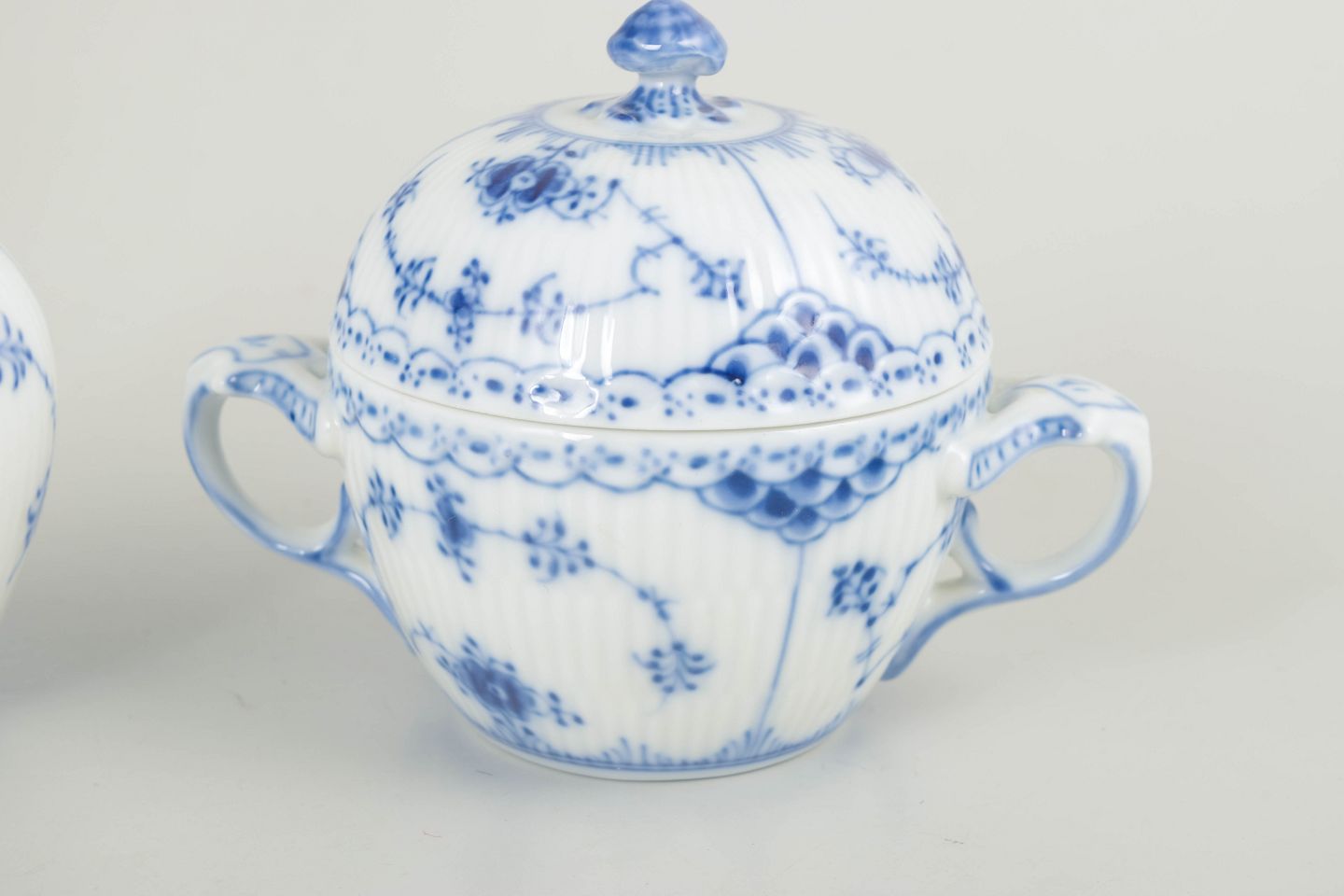 Set consisting of a creamer and a sugar bowl in the Blue Fluted Half Lace pattern. Both pieces are made in classic fluted forms with a pierced lace border and hand-painted cobalt blue decoration. A well-balanced and elegant set for coffee and tea service.