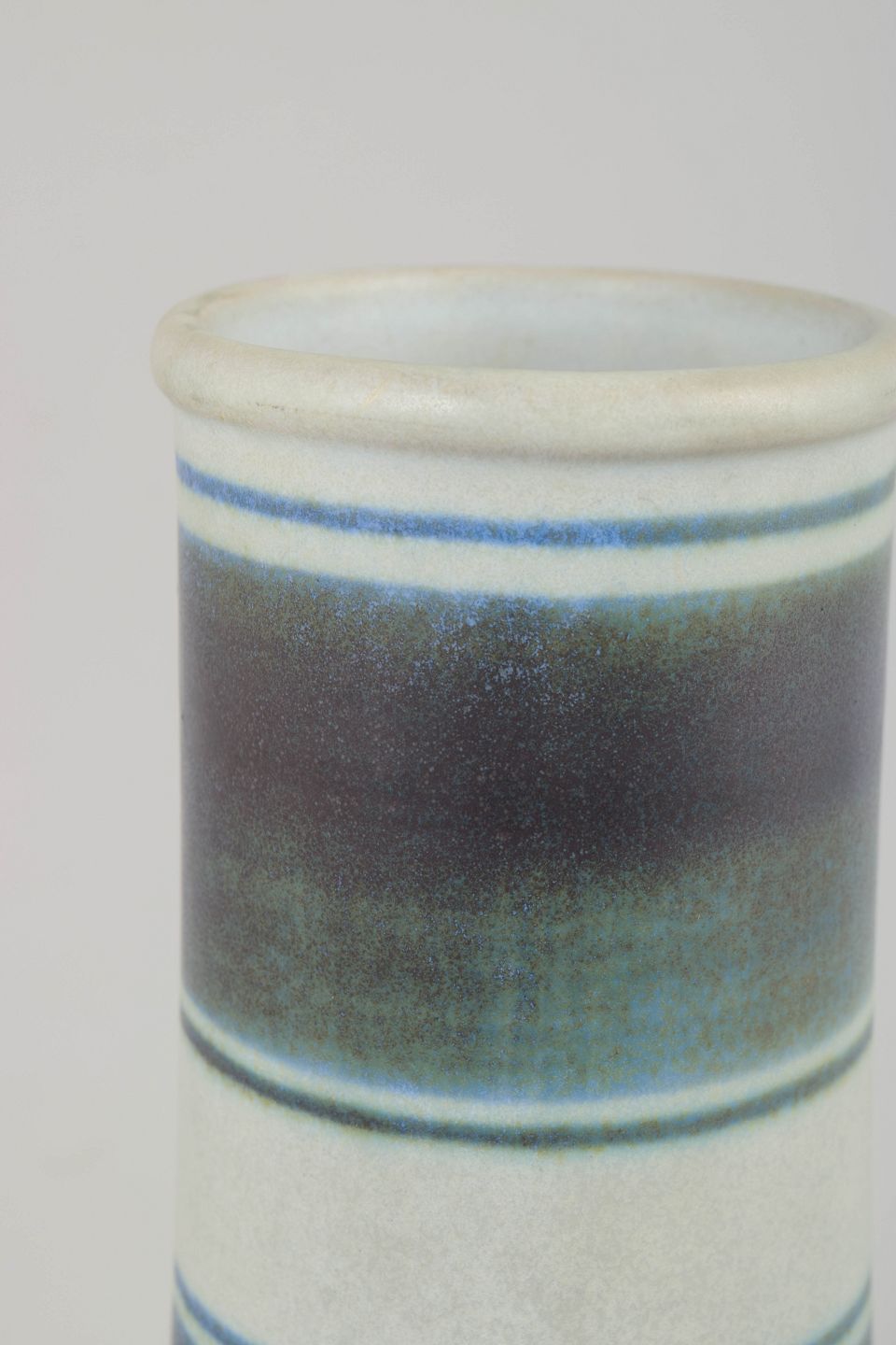 Slim and elegant stoneware vase from Gunnar Nylund’s “Banderillo” series, characterized by pronounced horizontal bands in blue-green and darker tones set against a light ground. The carefully balanced form with a gently narrowed neck gives the vase an architectural and rhythmic appearance, typical of Nylund’s work during the 1960s.