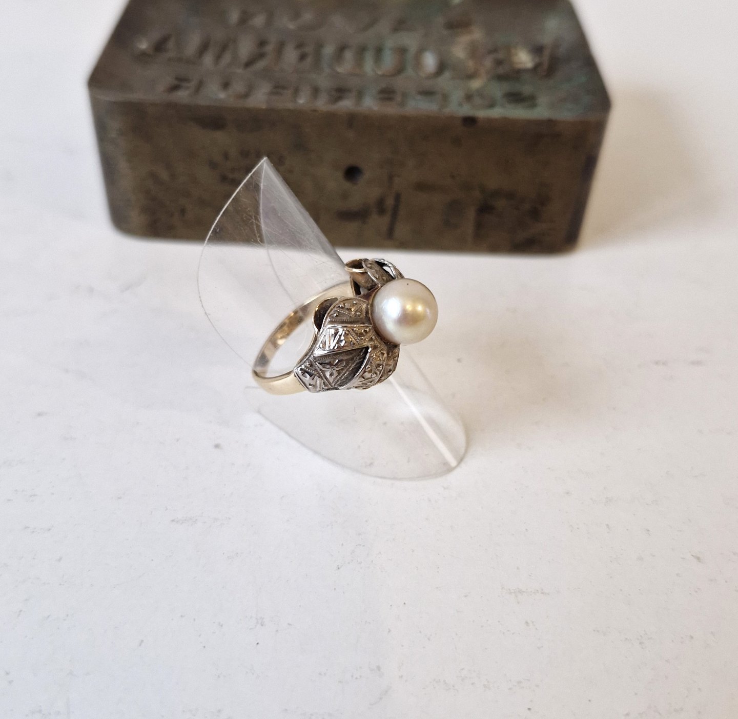 Vintage ring in 18 kt red and white gold with beautiful akoya pearl.