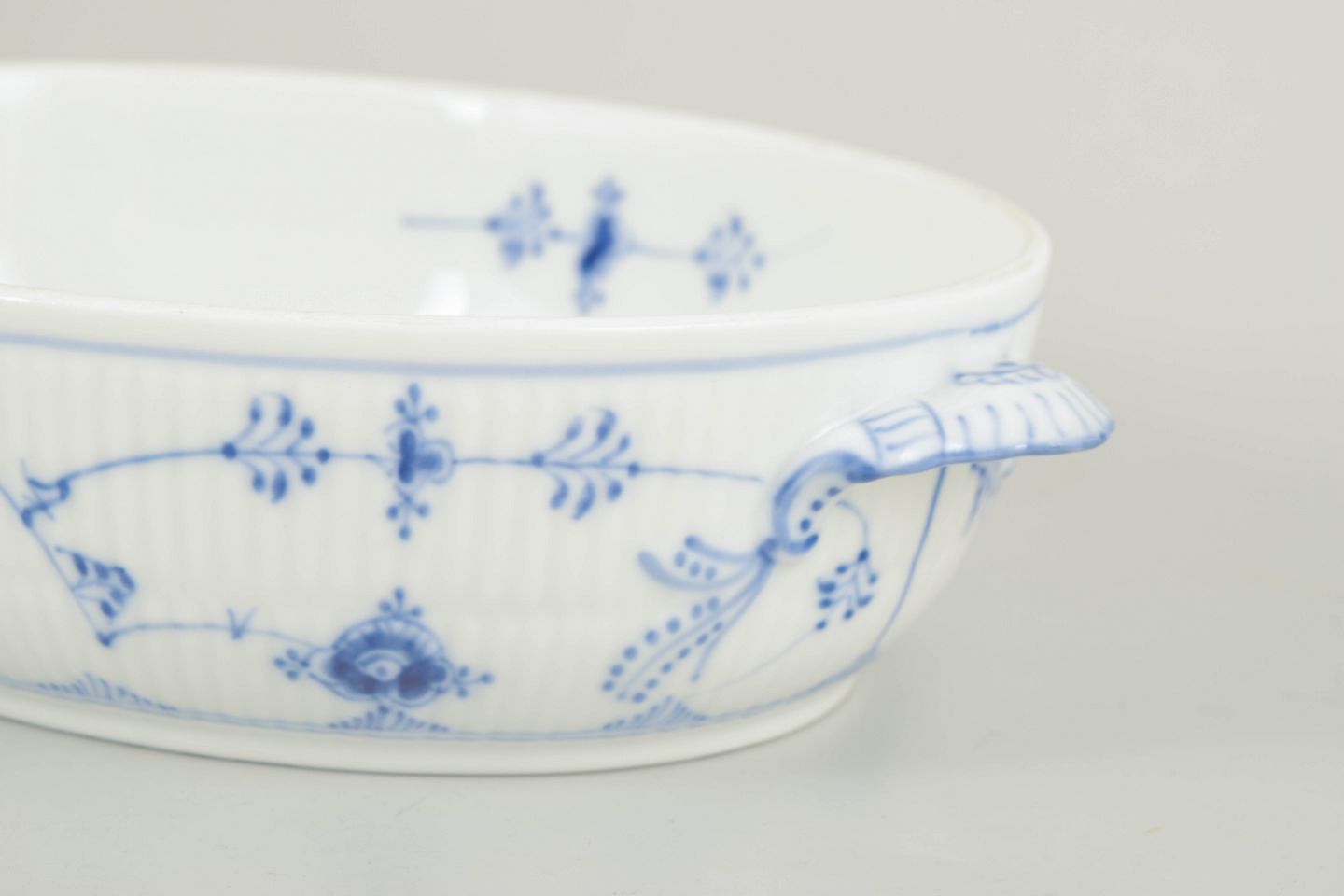 Classic oval tureen in Blue Fluted Plain with matching lid and finial handle. The tureen is made in the traditional fluted form and decorated with hand-painted cobalt blue underglaze in the iconic fluted pattern. An elegant and functional serving piece, suitable for soups, vegetables or hot dishes.