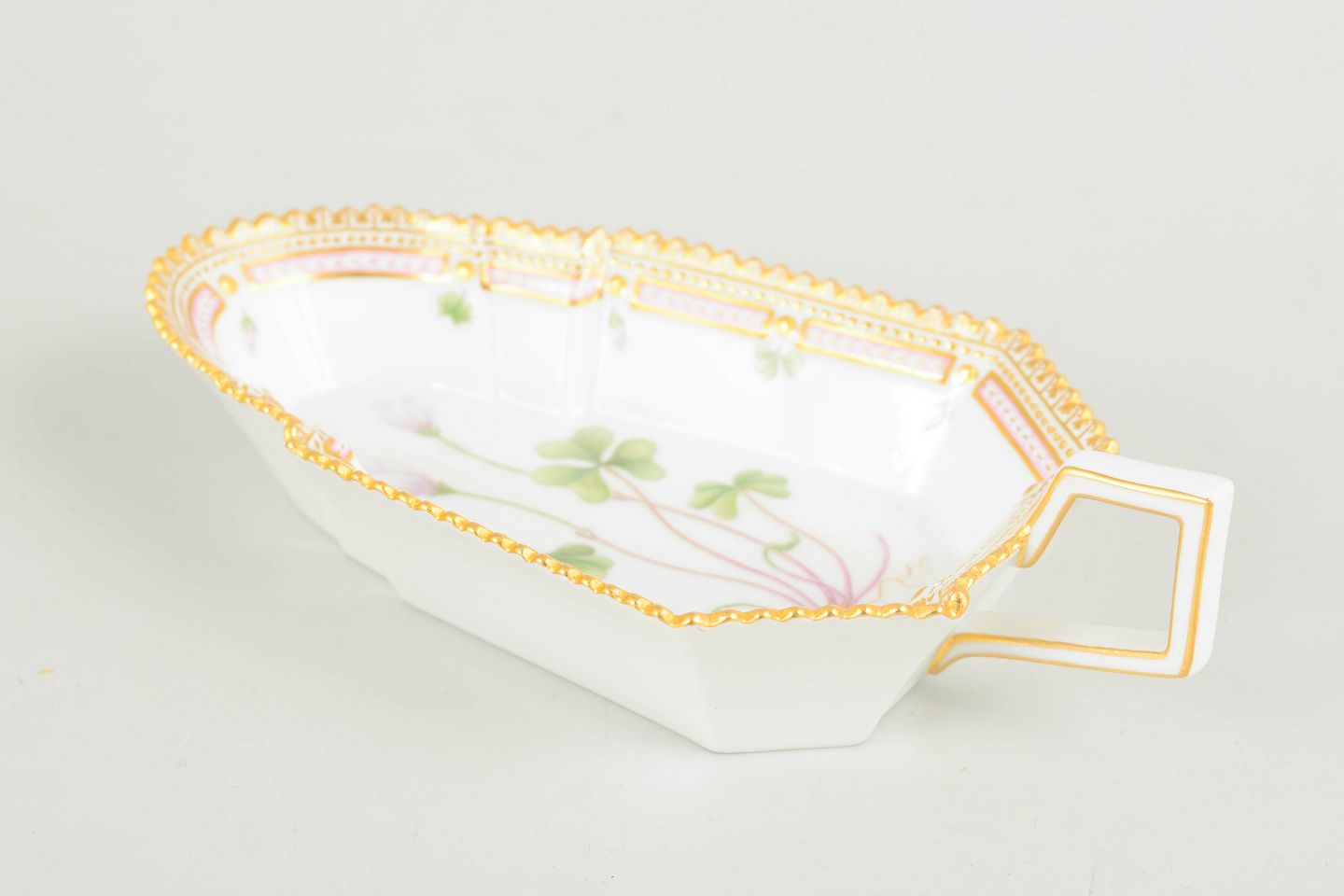 Elegant serving dish with handle from the iconic Flora Danica service. The dish is hand-painted with a botanical motif derived from the Flora Danica publication and executed in the service’s characteristic refined form with a decorative rim and pronounced handle. A decorative and functional serving piece, suitable for smaller servings.