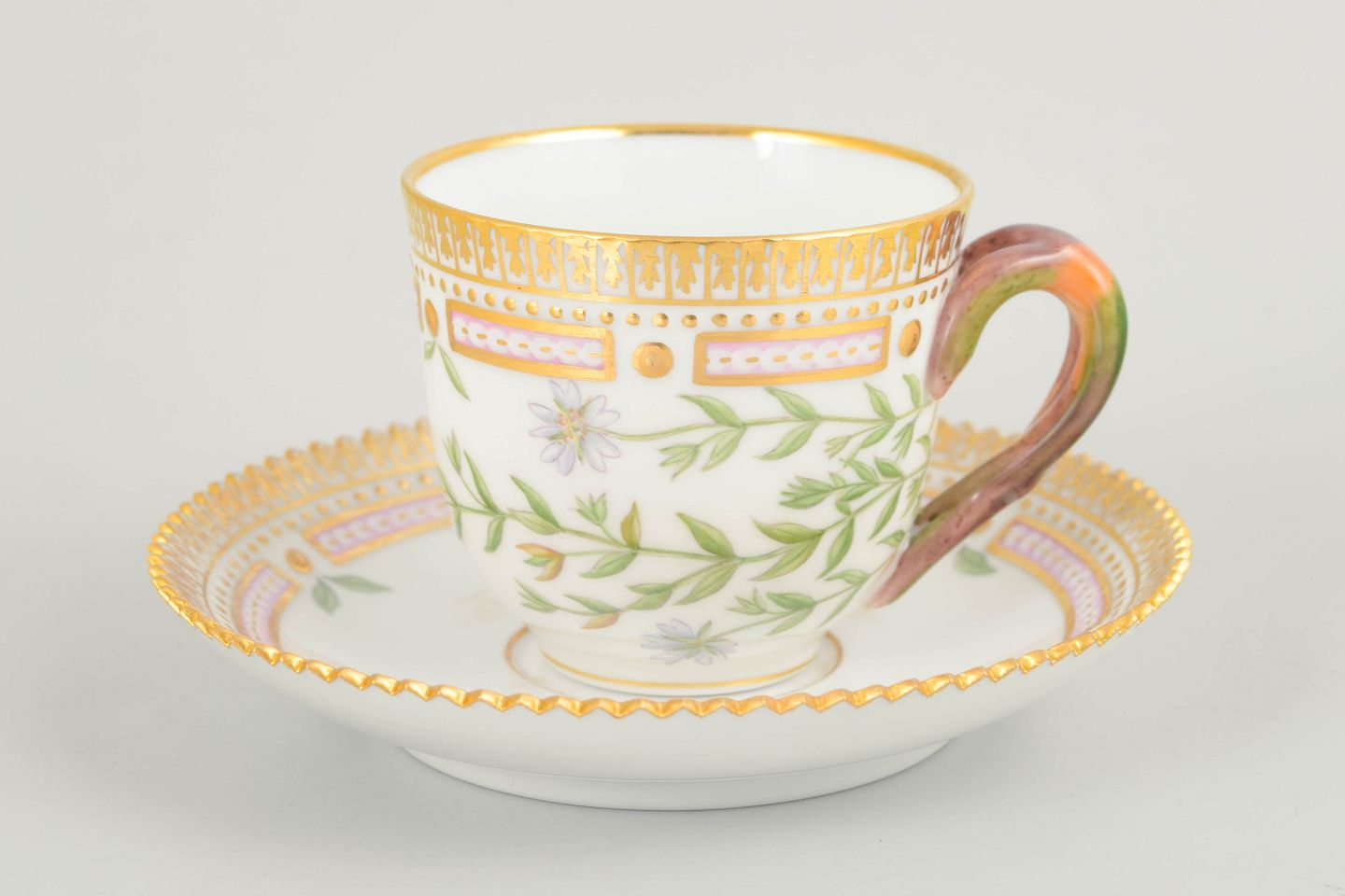 Elegant demitasse cup with matching saucer from the iconic Flora Danica service. The cup is hand-painted with a botanical motif derived from the Flora Danica publication and executed in the service’s characteristic refined form with a decorative rim. A classic and exclusive cup.