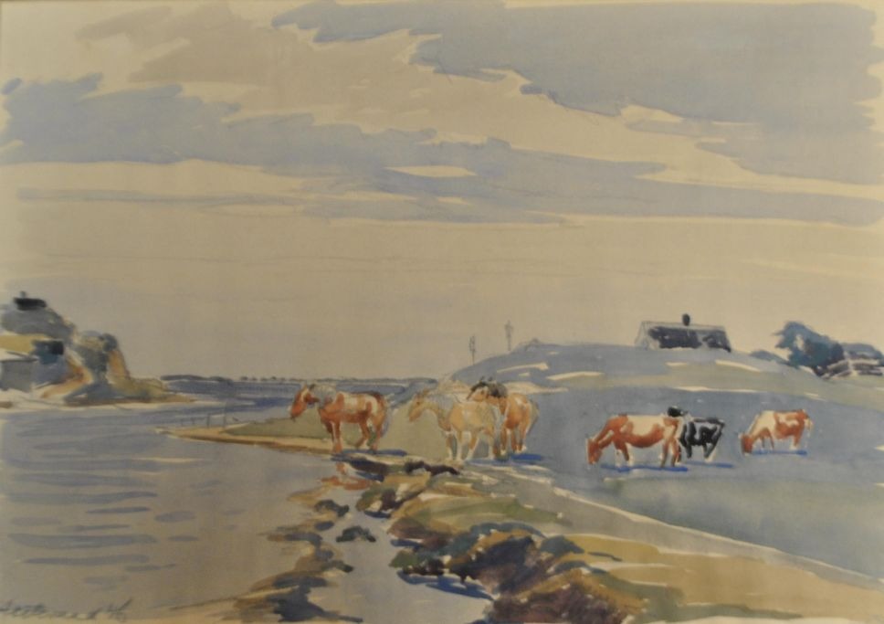 Svendsen, Albert (1889 - 1959) Denmark: Horses and cows by a fjord. Watercolor. Signed 1946. 28 x 40 cm.