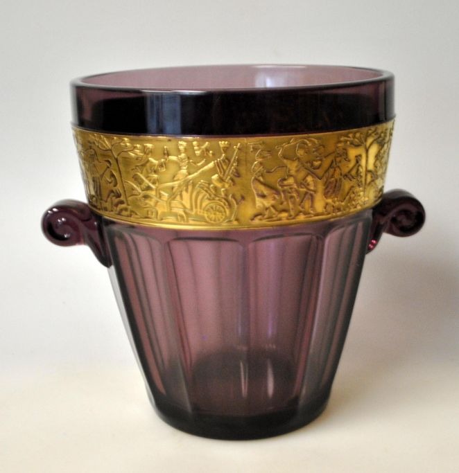 Moser, Ludvig & Söhne, Karlsbad, 1920s: A pair of ice buckets. In violet glass with etched gold frieze with motif, in German called "Krieger". H.: 14 cm.