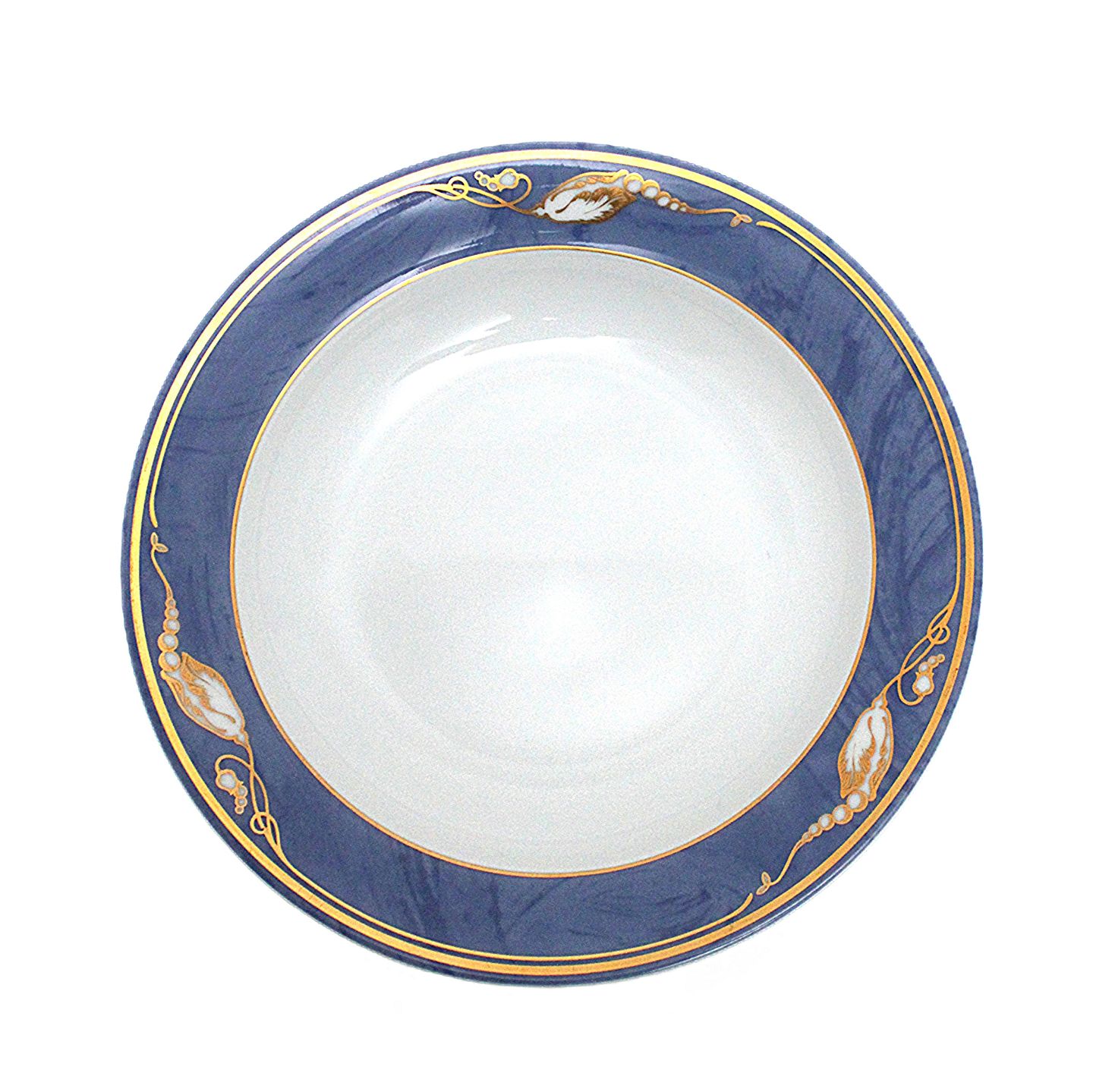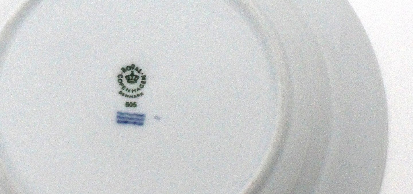 Text available in Danish: Royal Copenhagen, Blå Magnolia. Dyb tallerken. Blå marmoreret bort dekoreret med gylden blomsterknop. Designet af Flemming Eskildsen. Nr. 605. Diameter 22 cm. Højde 3,5 cm. I. sortering. Flot stand. Pris: 150 kr. stk. Lager: 4