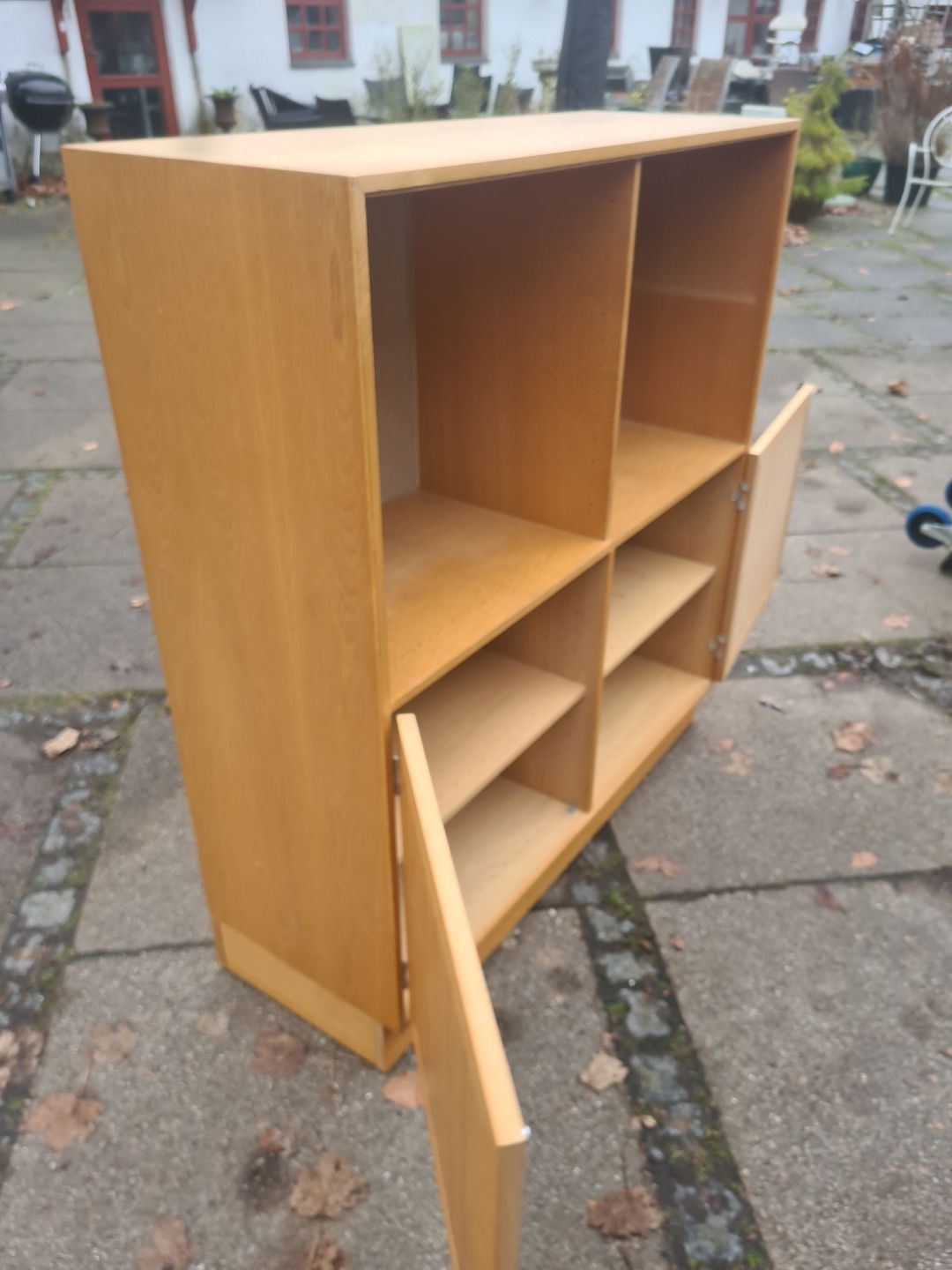 Reol i finéret eg med underskab og hessian beklædt bagbeklædning. Ydført hos HG Funiture i 1970'erne. Fremstår pæn og velholdt uden de store brugsspor.