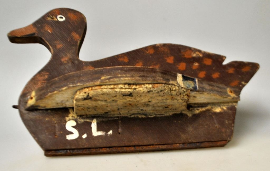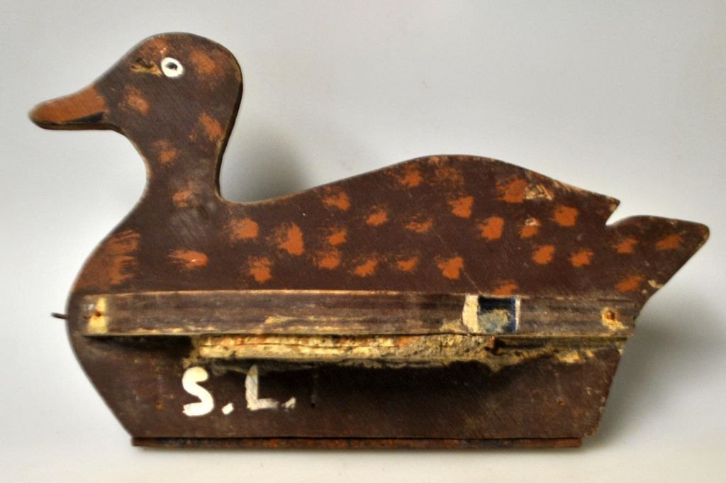 Decoy duck in painted pine, ca. 1920. Denmark. Painted brown with white and blue. Balance with iron and lead. L.: 29 cm. H: 16 cm.