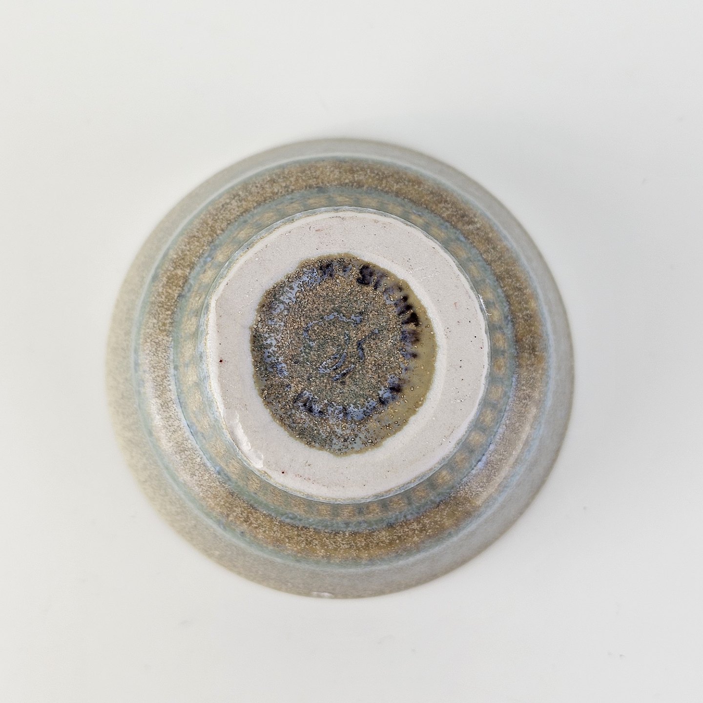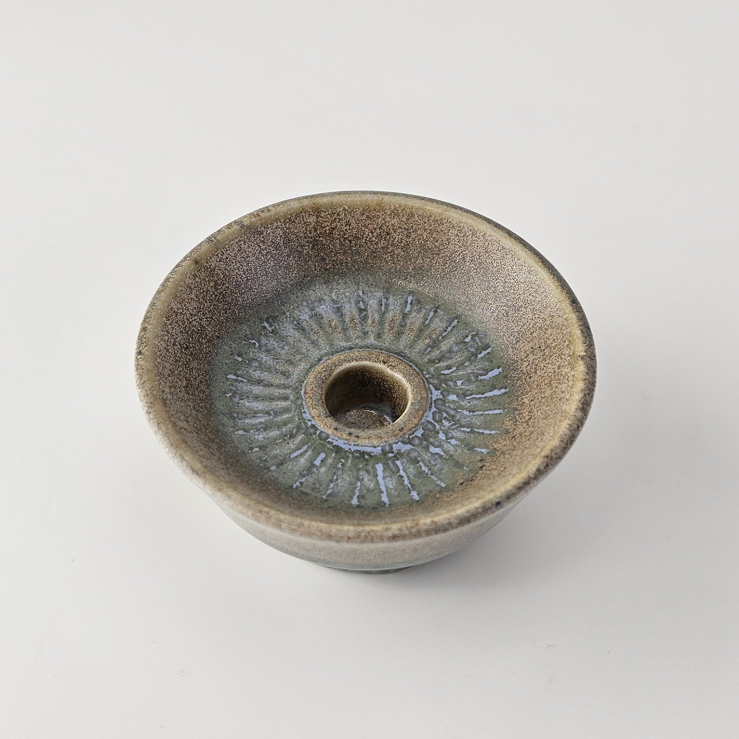 Text available in Danish: Lysestage af stentøj og dekoreret med en grønlig nuance glasering.