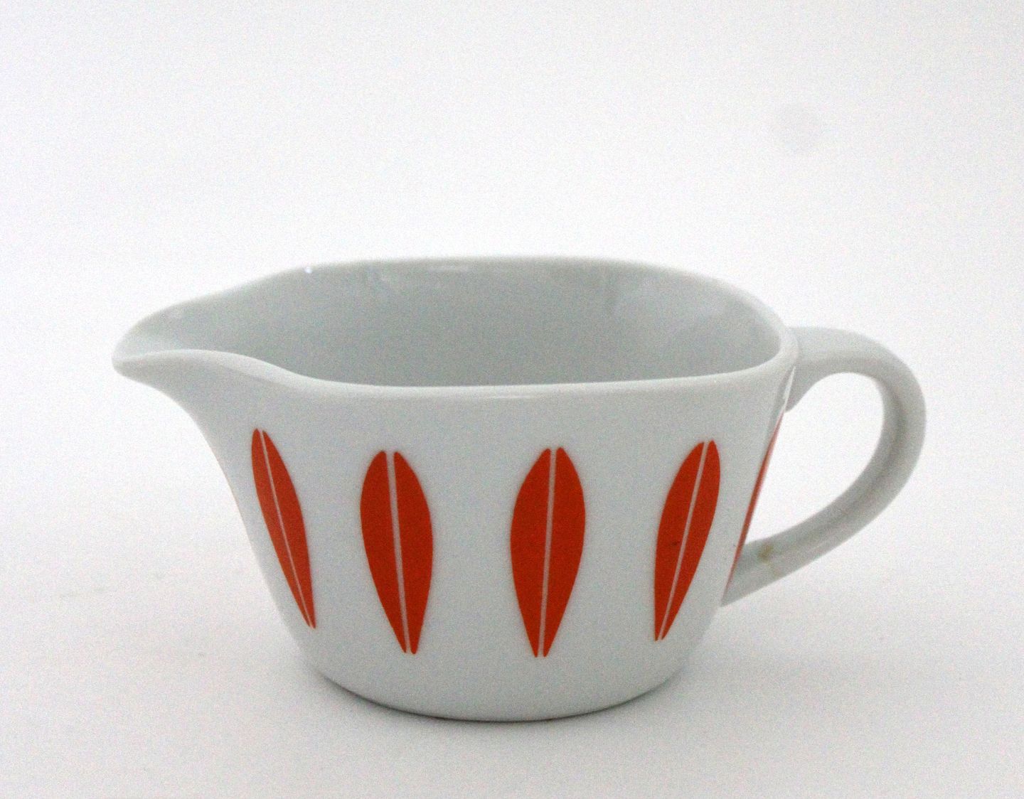 Text available in Danish: Lyngby, Dan-ild porcelæn, Orange Lotus, Flødekande. Serien Lotus er designet af Grete Prytz Kittelsen for Cathrineholm i 1950'erne. God stand med indvendig brændingsplet. Længde 12 cm. Bredde 7,5 cm. Højde 5 cm. Pris: 200 kr. stk. Lager: 1