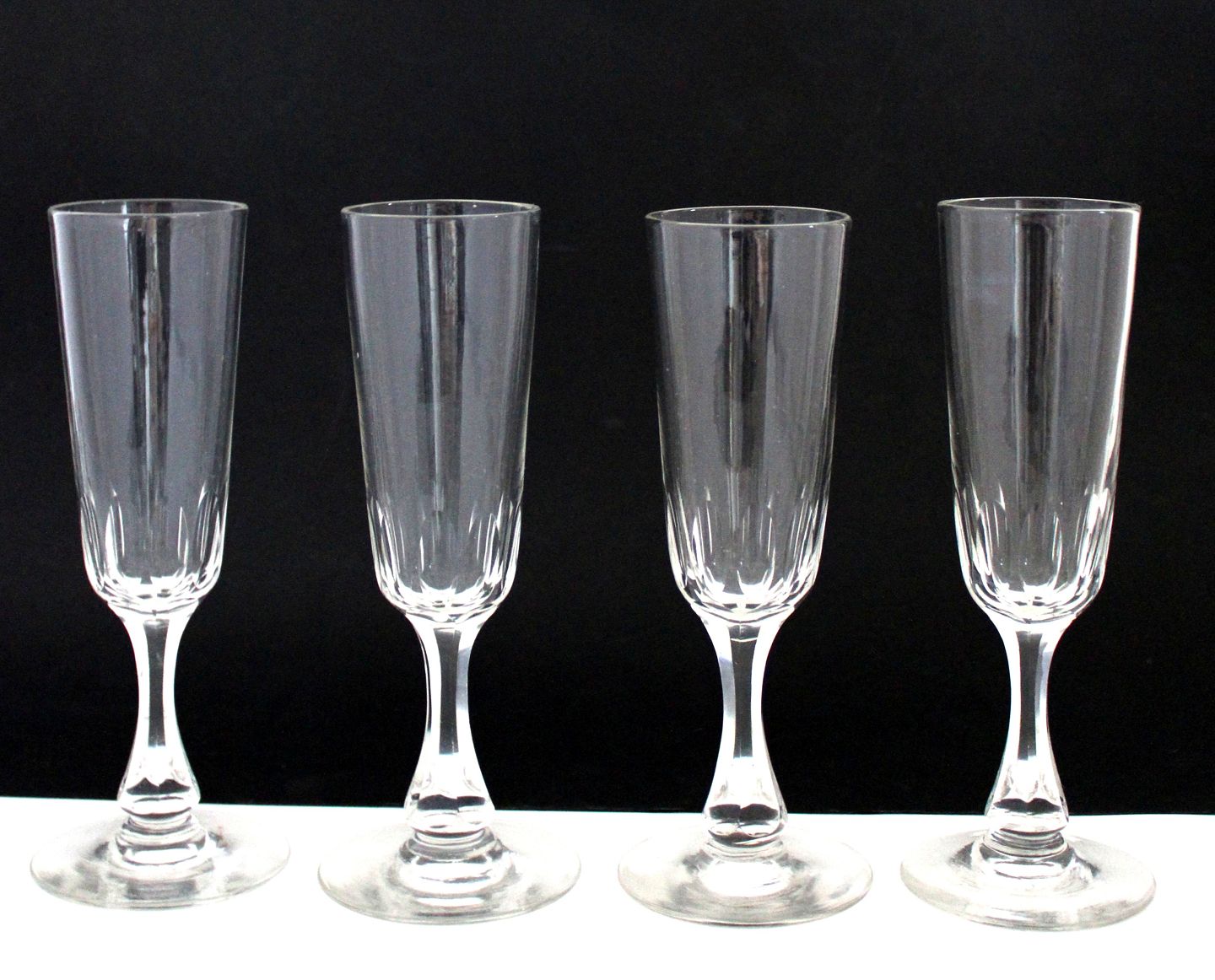 Text available in Danish: Derby Champagnefløjter. Oliveslibning i kumme, slebet stilk og rundslebet bund. Højden varierer fra 15,7 til 16,1 cm. Almindelig aldersbrusspor med den tids skavanker og skygger. Pris samlet for 4 stk: 800 kr.