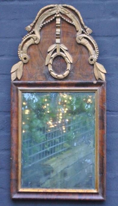 Danish Louis XVI mirror, walnut veneer, circa 1780. H.: 70 cm. W.: 34 cm.