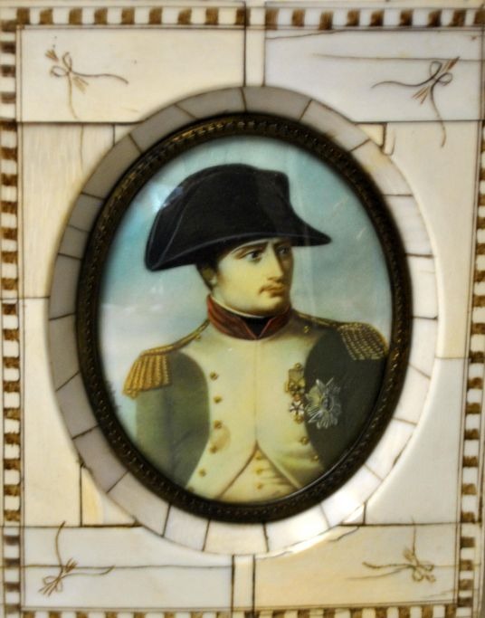 Miniature painting, Portrait of Napoleon Boneparte. 19th century. Signed: De Laroc. Oval. 8.5 x 6.5 cm. Framed in a French bone frame with decorations. 14 x 11 cm.