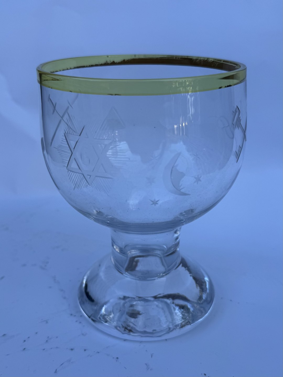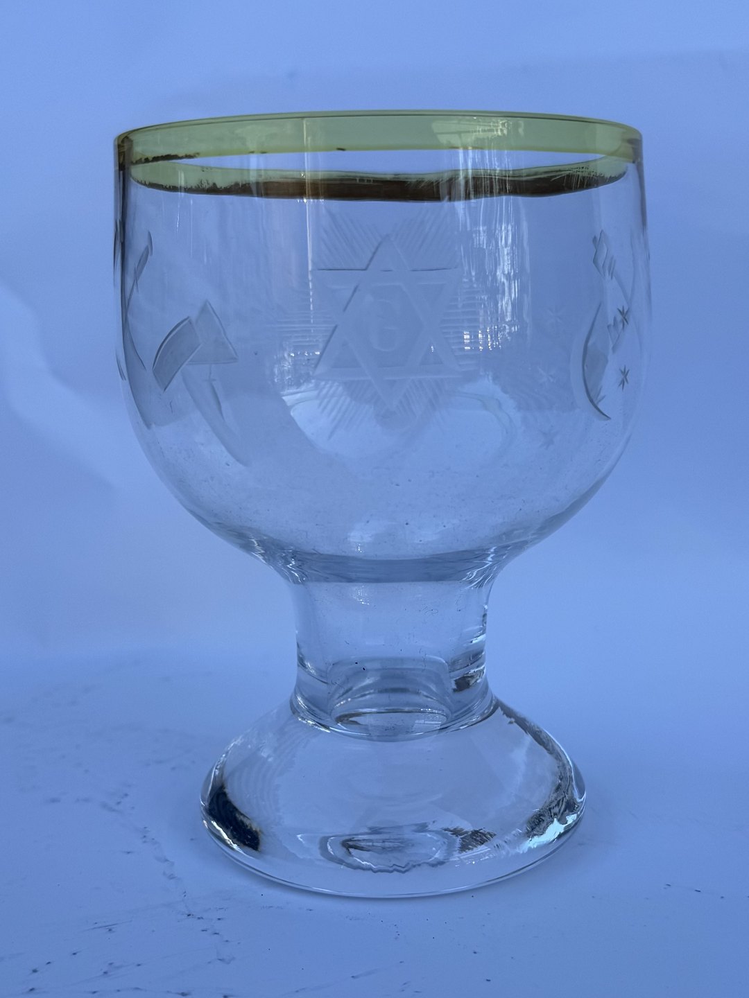 Big size drinking glass with gold rim. A fine glass for e.g. beer. Standing on a sturdy base. Engraved Masonic symbols around the glass. Appears in good condition. Presumably made in the 1930s. H. 14 cm.